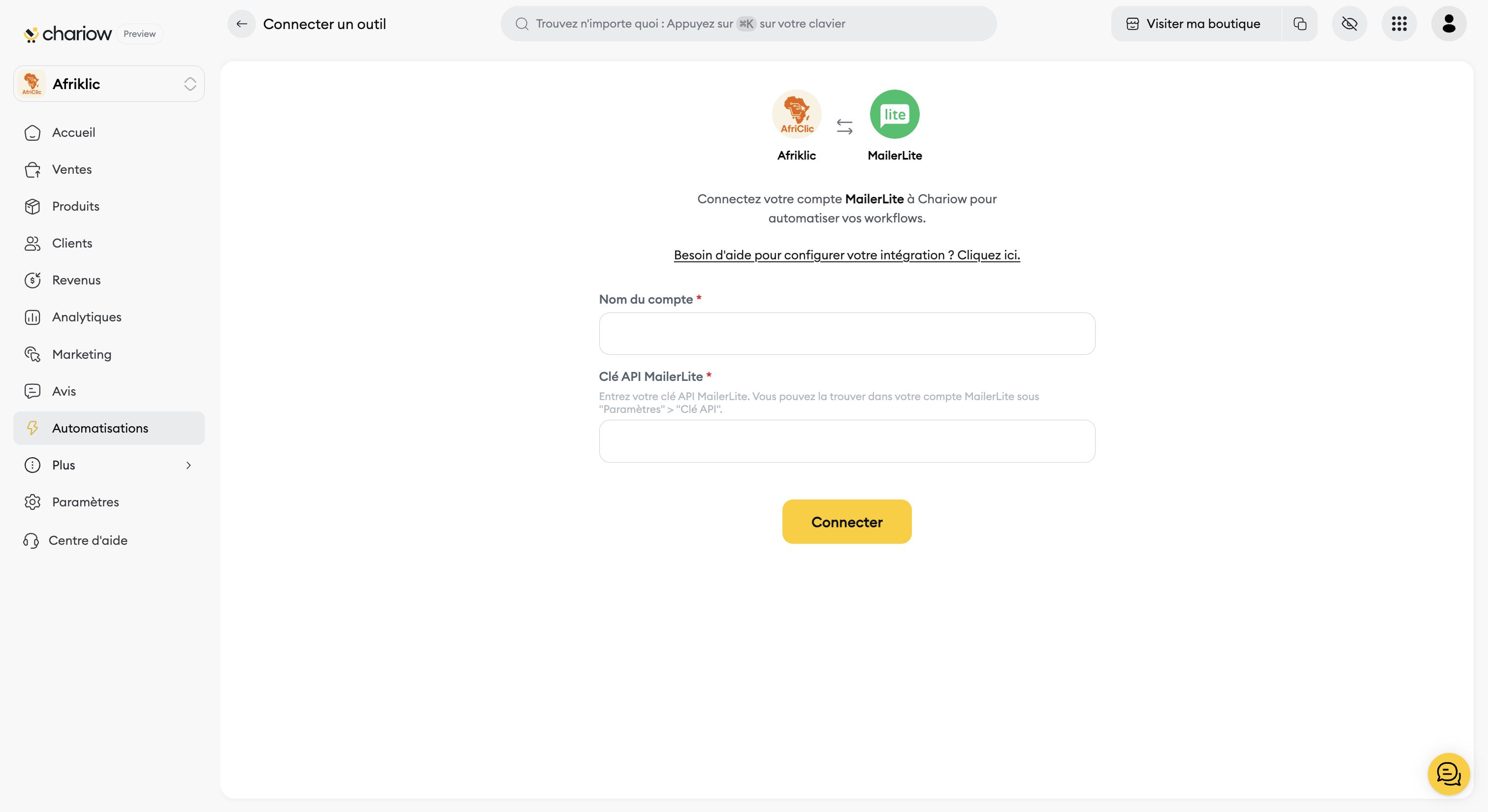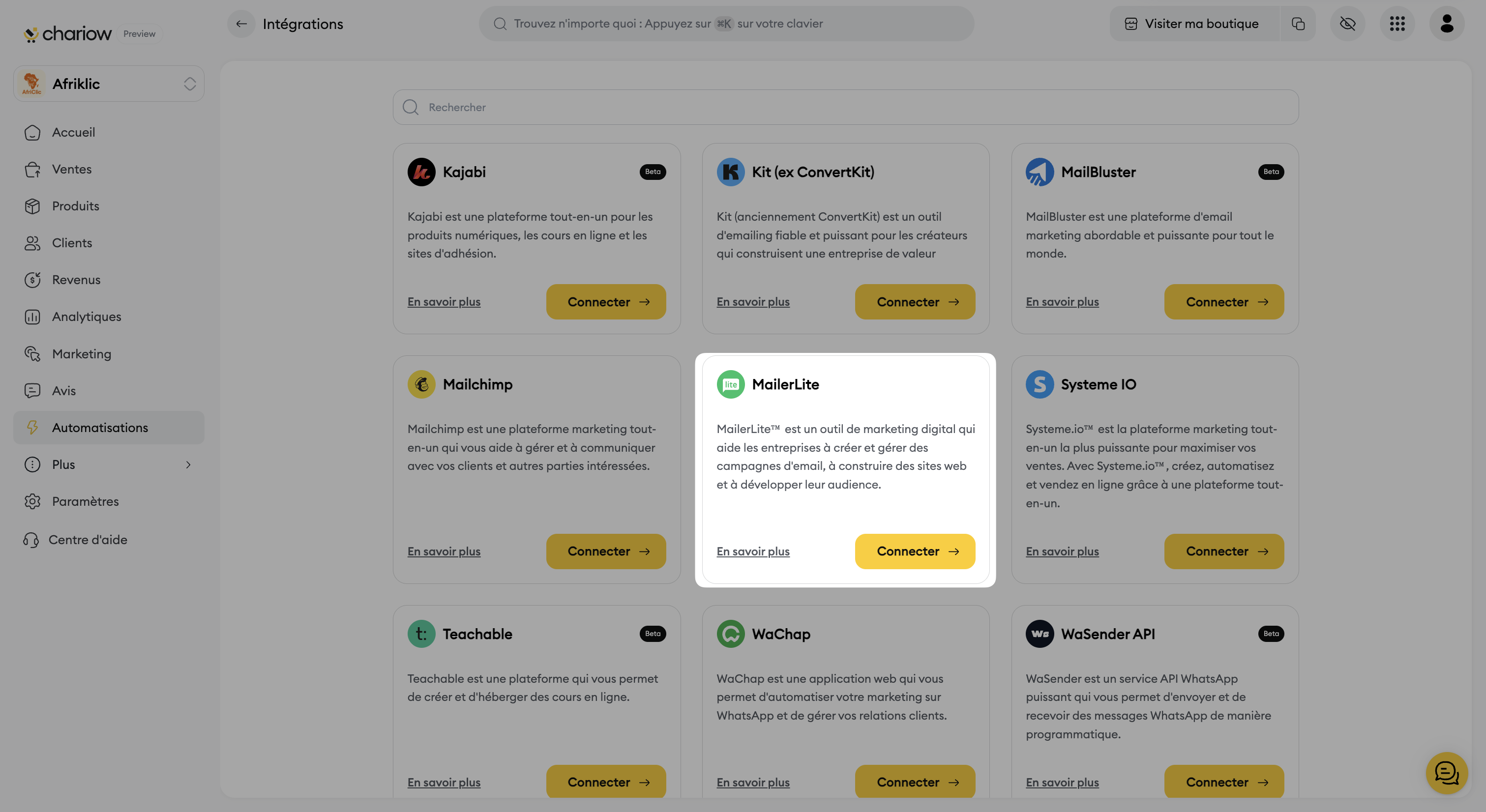 Maintenant que vous avez votre clé API MailerLite, connectons MailerLite à Chariow.