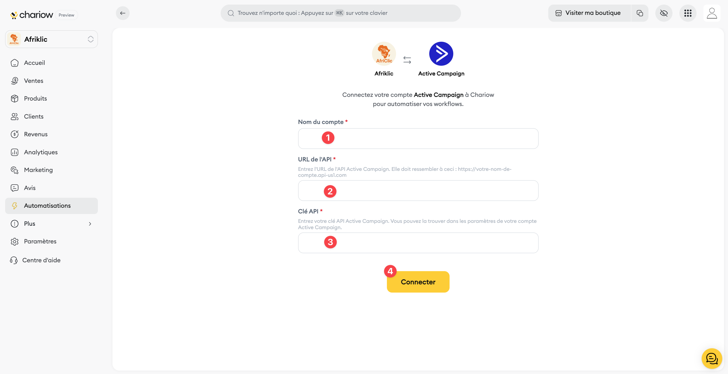 URL API (2) : Collez l'URL API que vous avez copiée depuis votre compte Active Campaign.