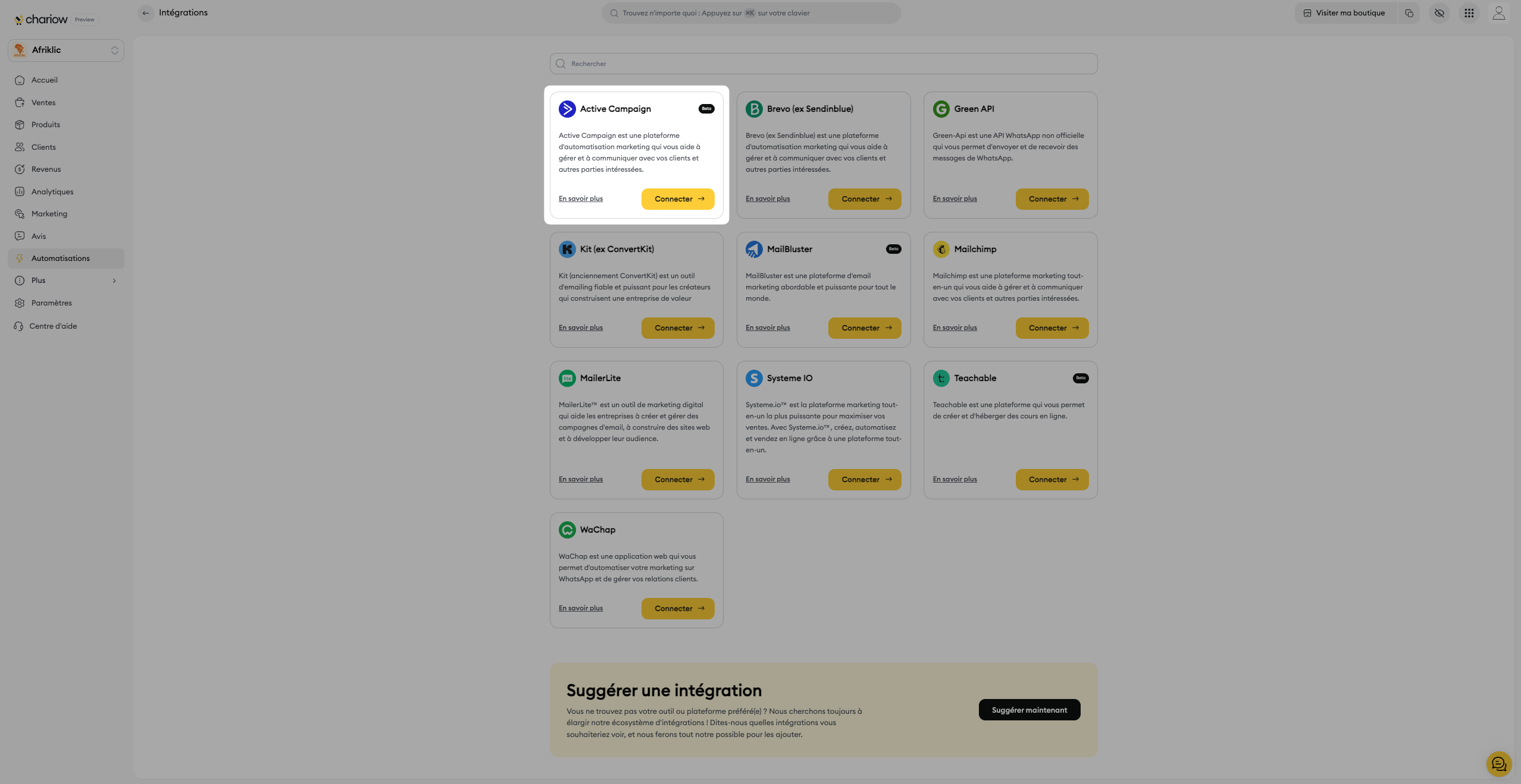 Identifiez Active Campaign dans la liste des outils disponibles et cliquez sur le bouton "Connecter".