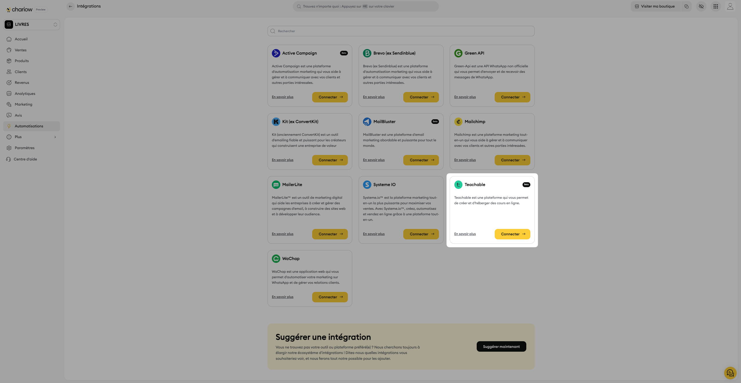 Sur votre tableau de board Chariow, rendez-vous dans la section Automatisations, puis cliquez sur Intégrations.