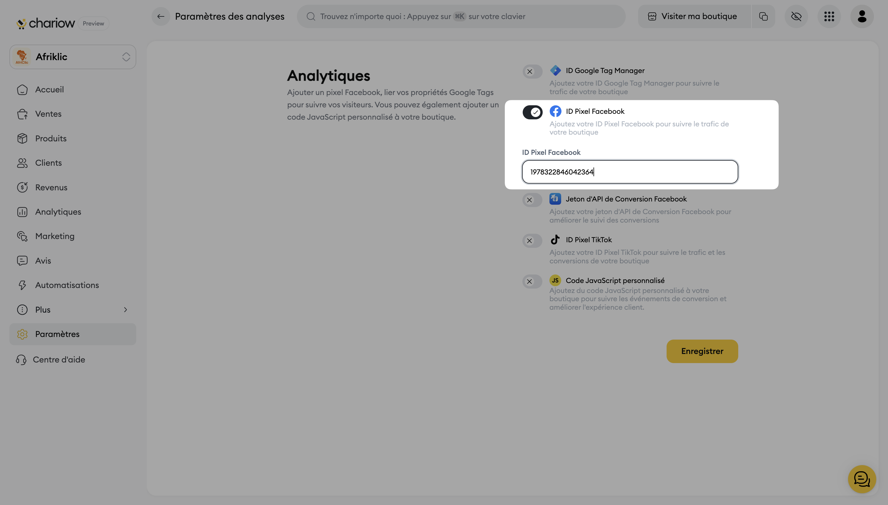Allez dans Paramètres puis accédez à la section Analytiques & Pixels au niveau de Gestion & Opérations.