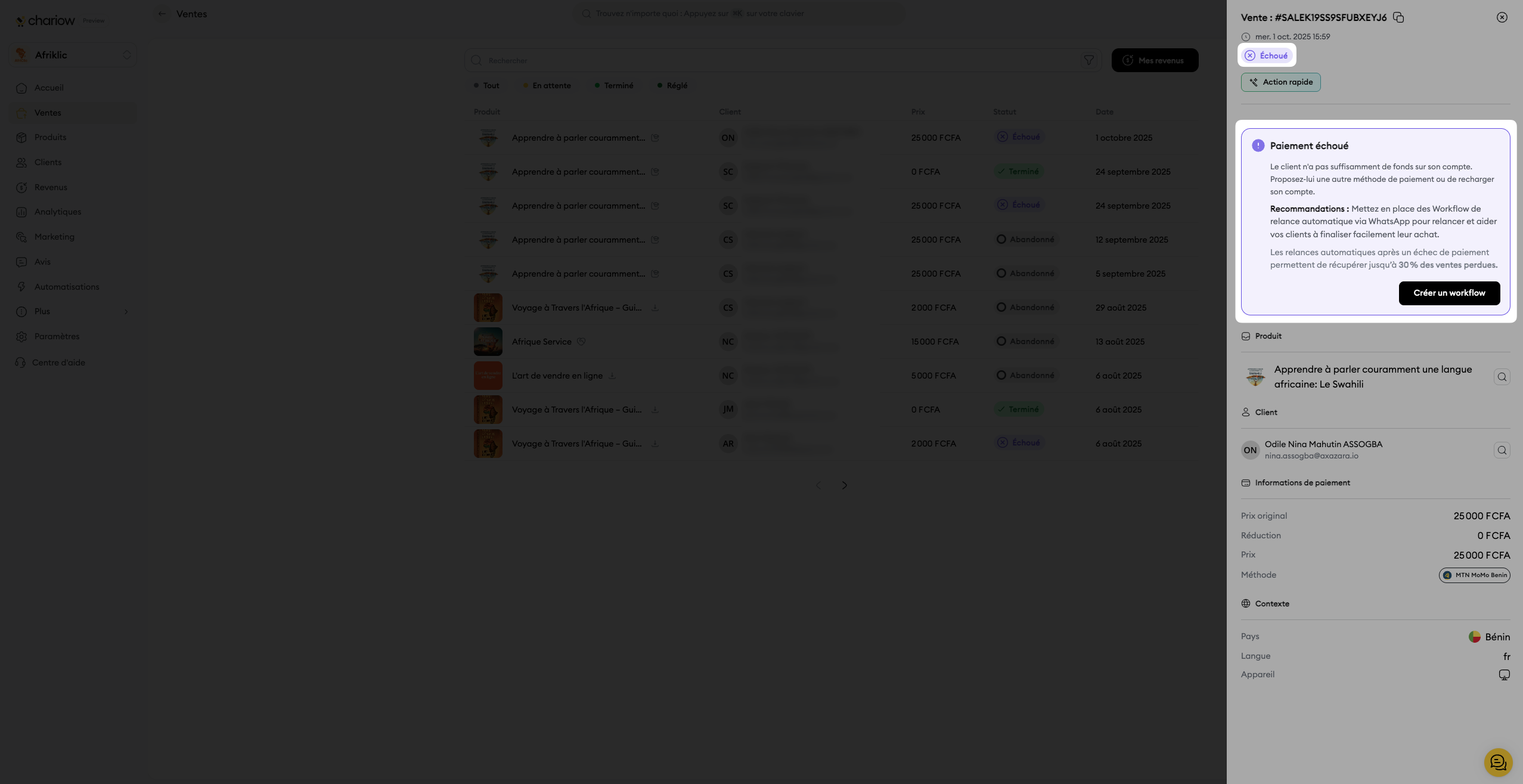 Lorsqu'une transaction échoue, il est crucial de comprendre la raison de cet échec pour pouvoir agir en conséquence, que ce soit en contactant le client, en le relançant grâce aux workflows ou en ajustant les paramètres de votre produit. Chariow vous permet de consulter facilement le motif précis de chaque paiement échoué.