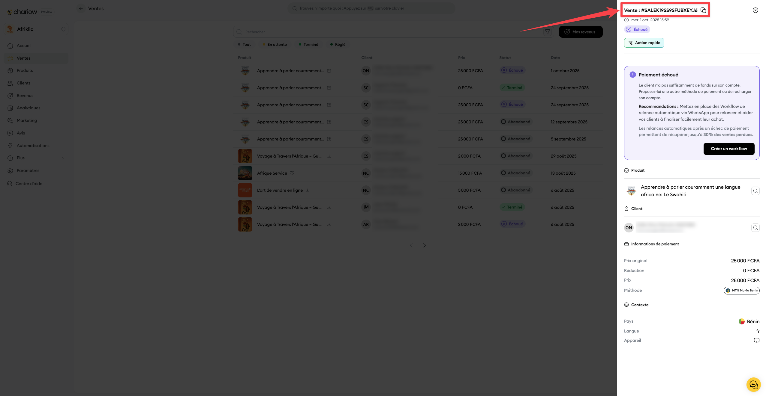 L'ID d'une commande est un identifiant unique attribué à chaque transaction sur Chariow. Cet identifiant est essentiel pour le suivi, le support client ou la vérification d'un paiement, notamment en cas de vente échouée.