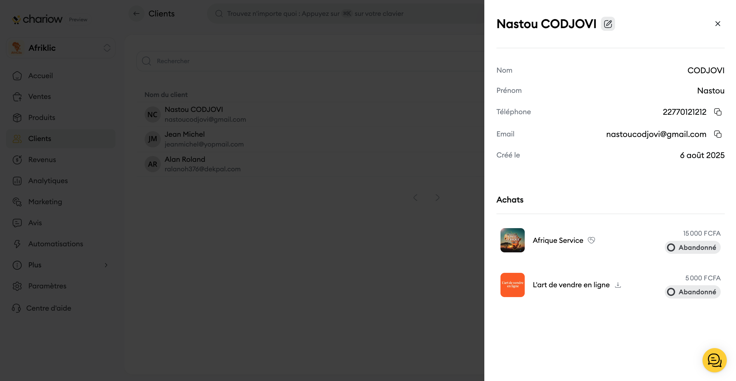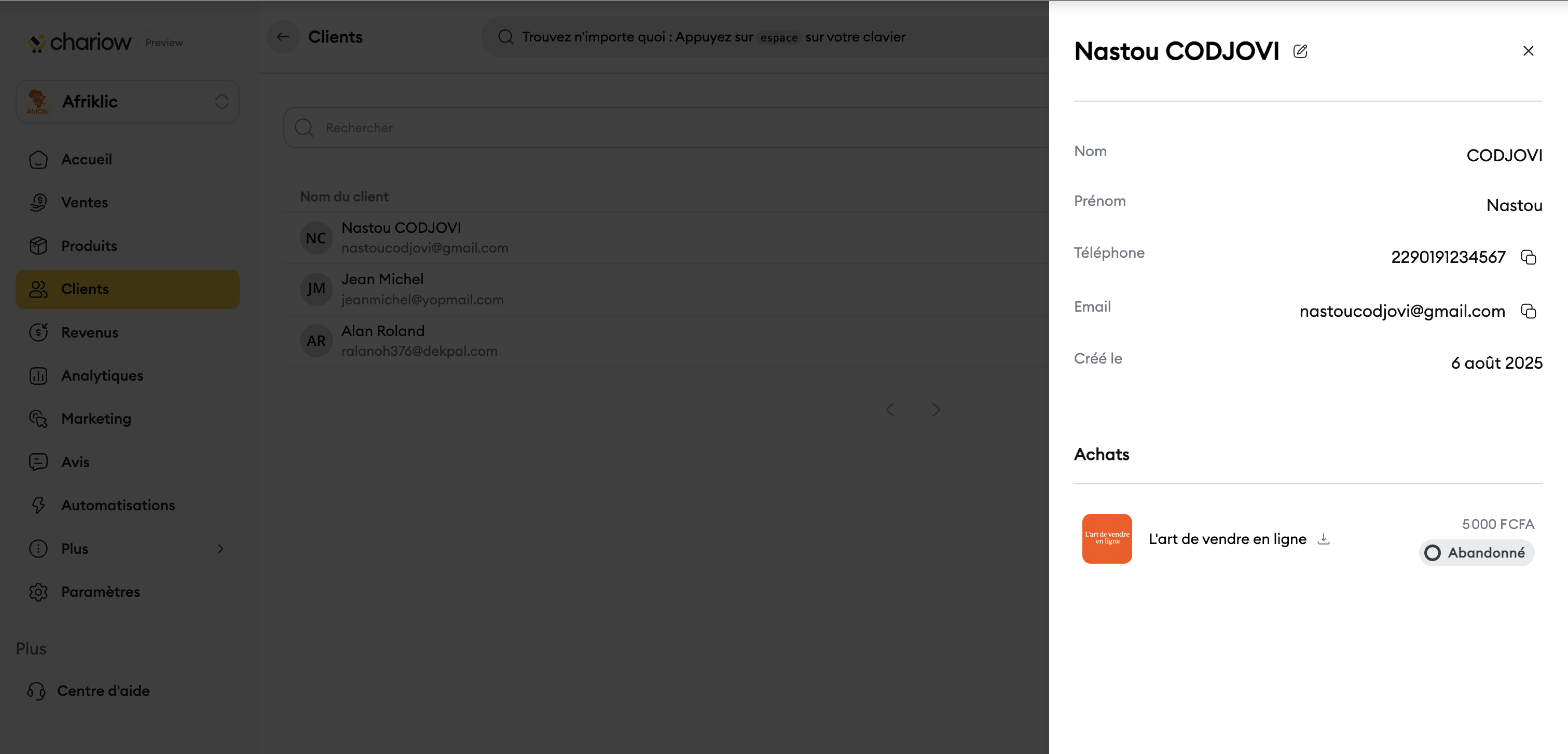 La section "Clients" vous permet de consulter et de gérer l'ensemble des personnes qui ont effectué un achat sur votre boutique Chariow. C'est un outil précieux pour suivre votre clientèle et bâtir des relations durables.