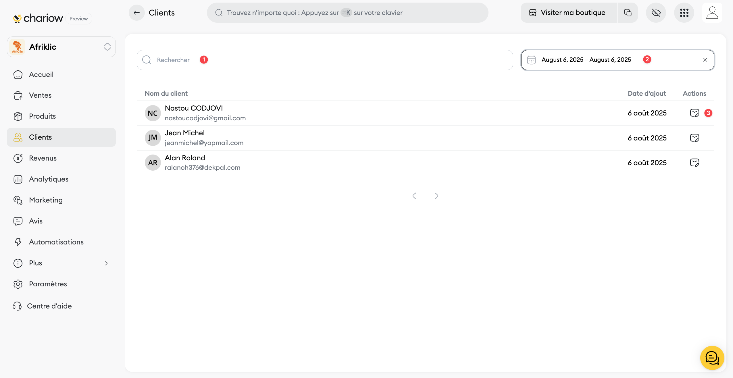 Vous verrez apparaître la liste de tous vos clients avec leur nom, leur adresse e-mail et la date de leur ajout.