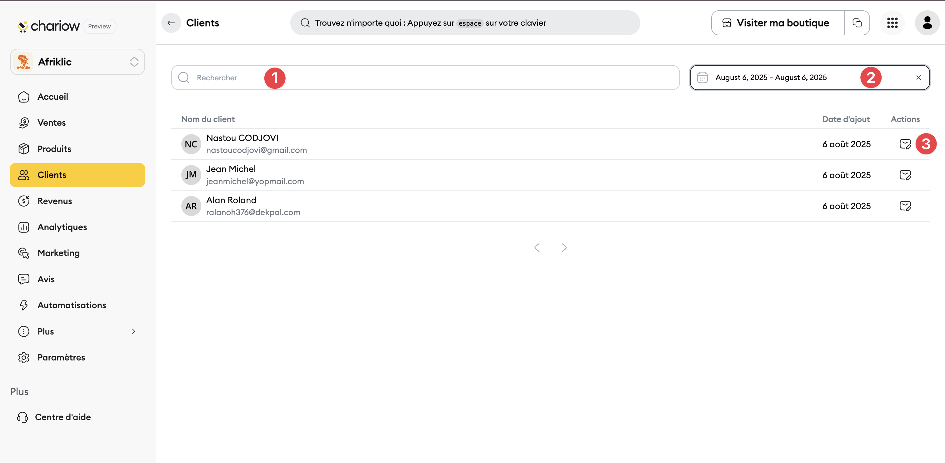 Barre de recherche (1) : Utilisez la barre de recherche pour retrouver un client spécifique par son nom ou son adresse e-mail.