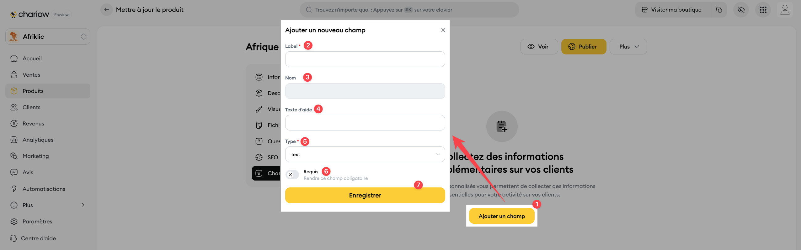 Cliquez sur "Ajouter un champ" : Une fenêtre s'ouvrira et vous devrez renseigner quelques informations
