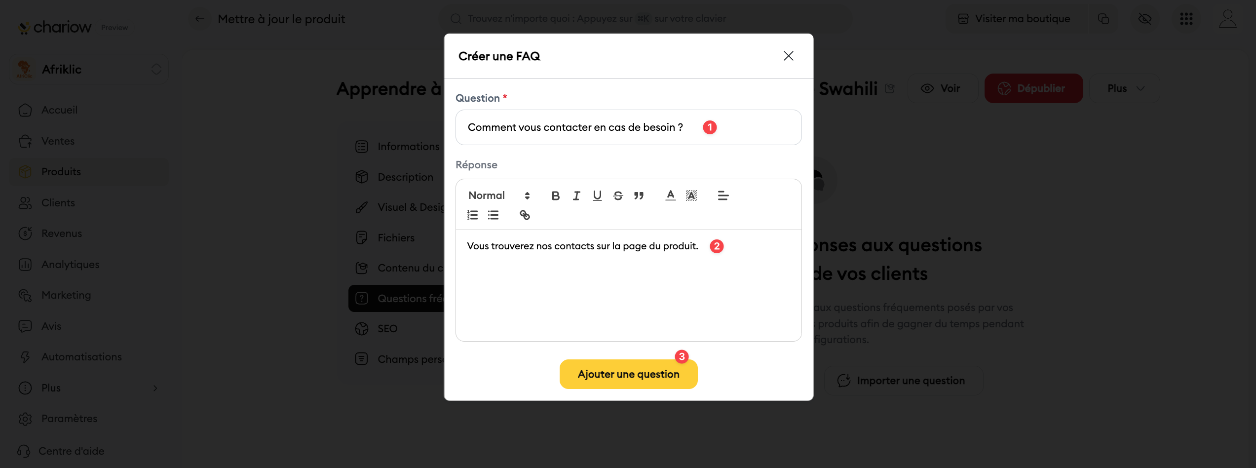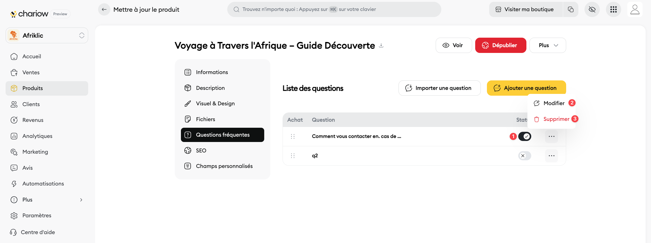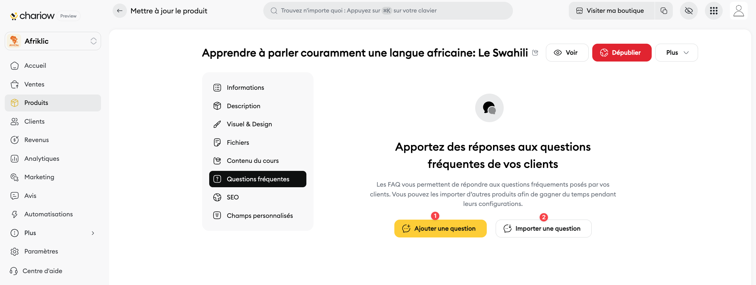 Cliquez sur le bouton "Importer une FAQ": Si vous avez déjà une liste de questions-réponses pour un autre produit, vous pouvez l'importer en quelques clics pour gagner du temps.