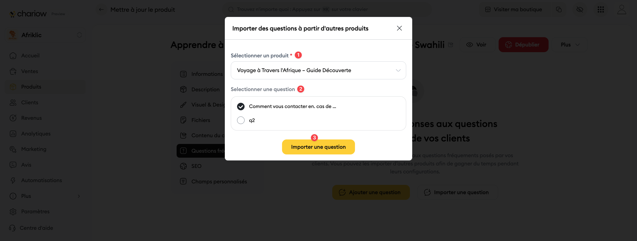 Sélectionnez le produit duquel vous souhaitez importer les questions-réponses.