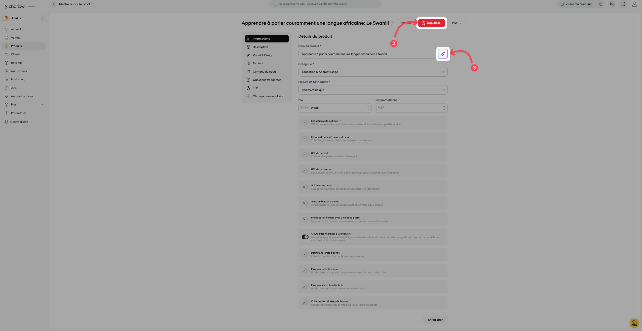 Si vous souhaitez dépublier le produit, suivez les mêmes étapes. Le bouton "Dépublier" apparaîtra et vous pourrez le sélectionner.