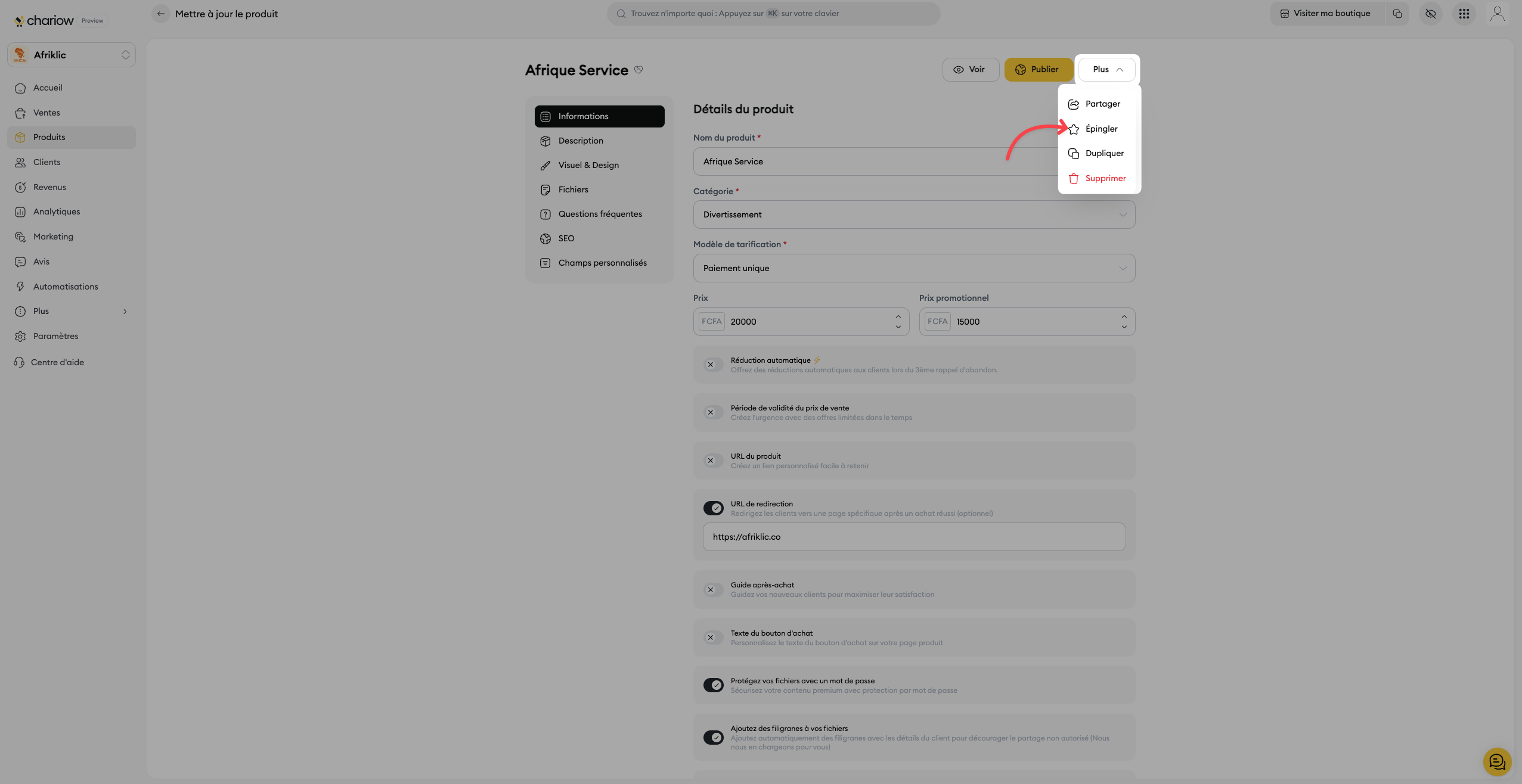 Pour mettre en avant vos produits les plus populaires ou les plus récents, Chariow vous permet de les "épingler" en haut de votre boutique. Un produit épinglé reste visible en première position, peu importe le nombre de nouveaux produits ajoutés. De la même manière, vous pouvez le "désépingler" pour qu'il reprenne sa place dans l'ordre chronologique de publication.