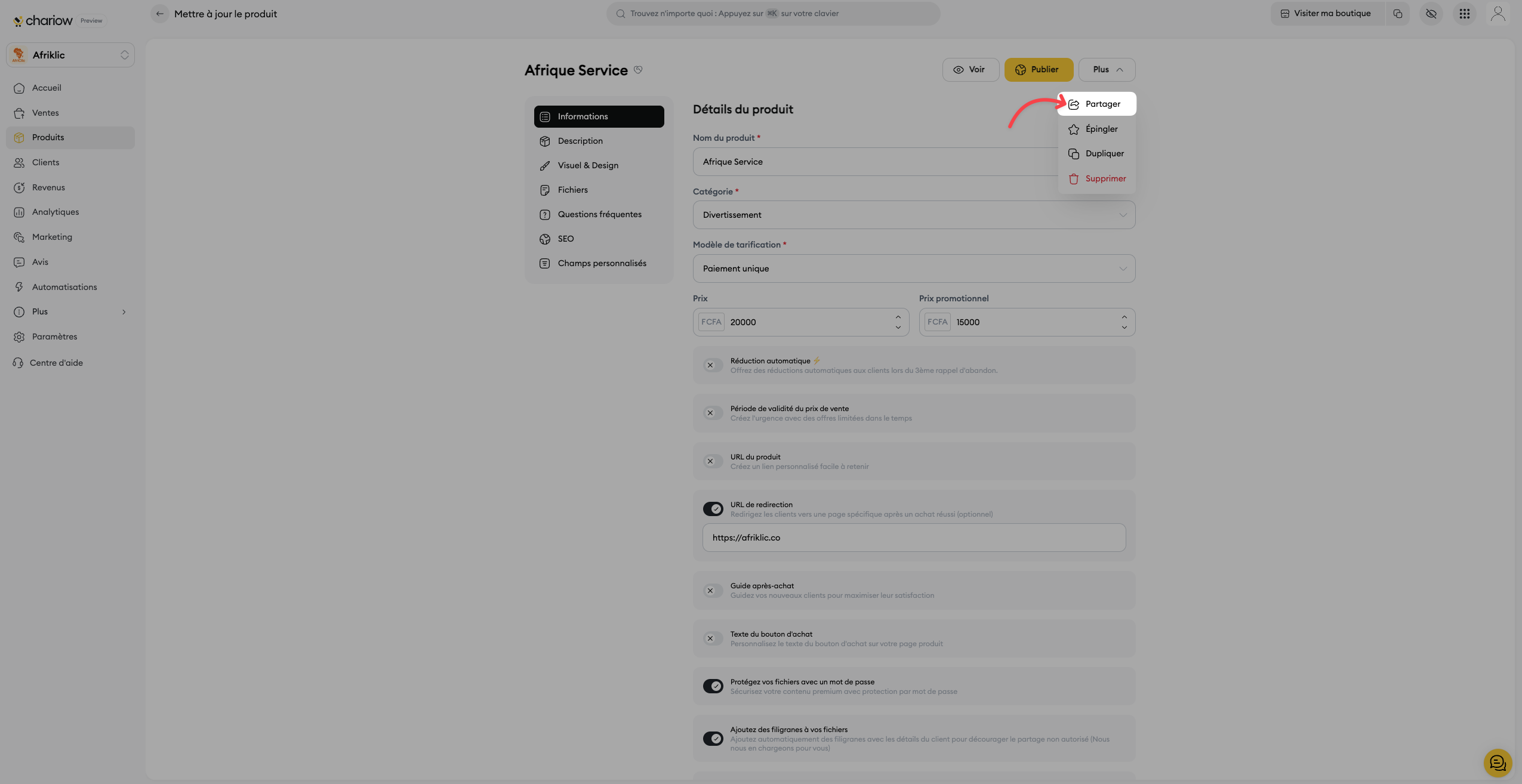 Dans le menu qui s'affiche, cliquez sur "Partager le produit".