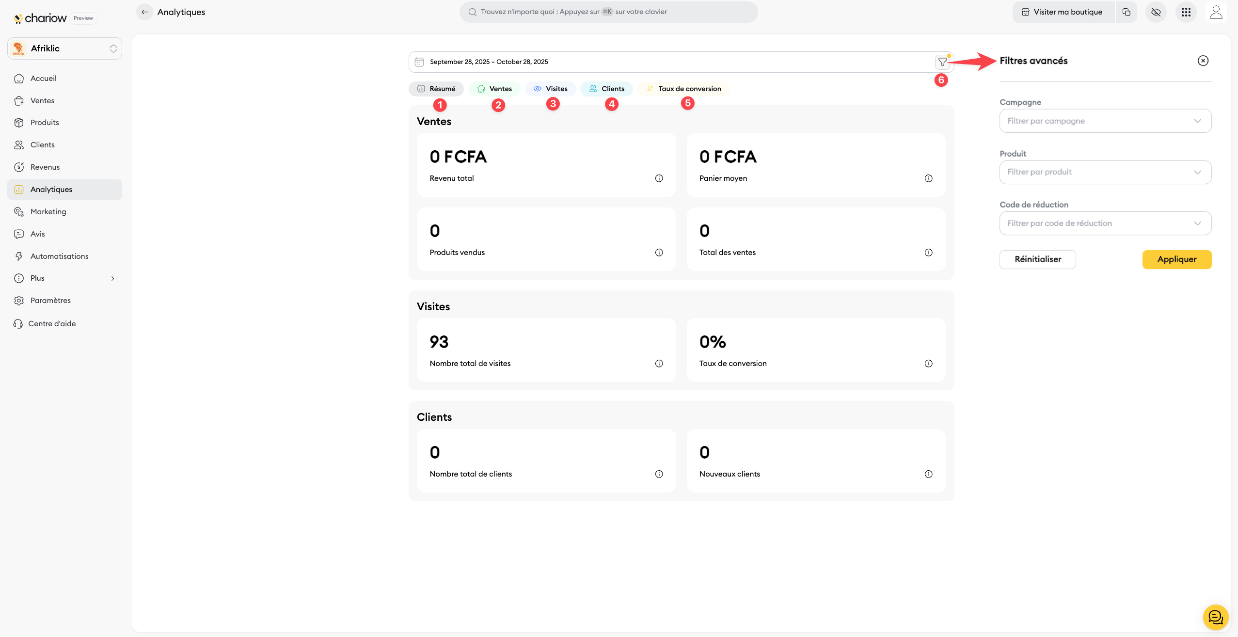 Les données analytiques sont un atout majeur pour faire grandir et optimiser votre boutique en ligne. La section Analytiques de votre tableau de bord Chariow a été conçue pour vous fournir une vue d'ensemble claire et détaillée de la performance de votre activité, depuis les revenus jusqu'au comportement de vos visiteurs.