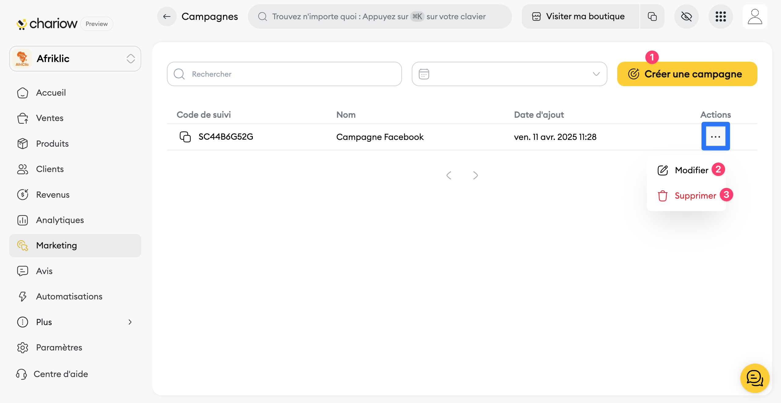La section Campagnes de votre tableau de bord Chariow a un objectif précis: vous permettre de mesurer l'efficacité de vos actions promotionnelles. En générant un code de suivi associé à votre URL, vous pouvez identifier l'origine de vos clients et optimiser vos efforts.