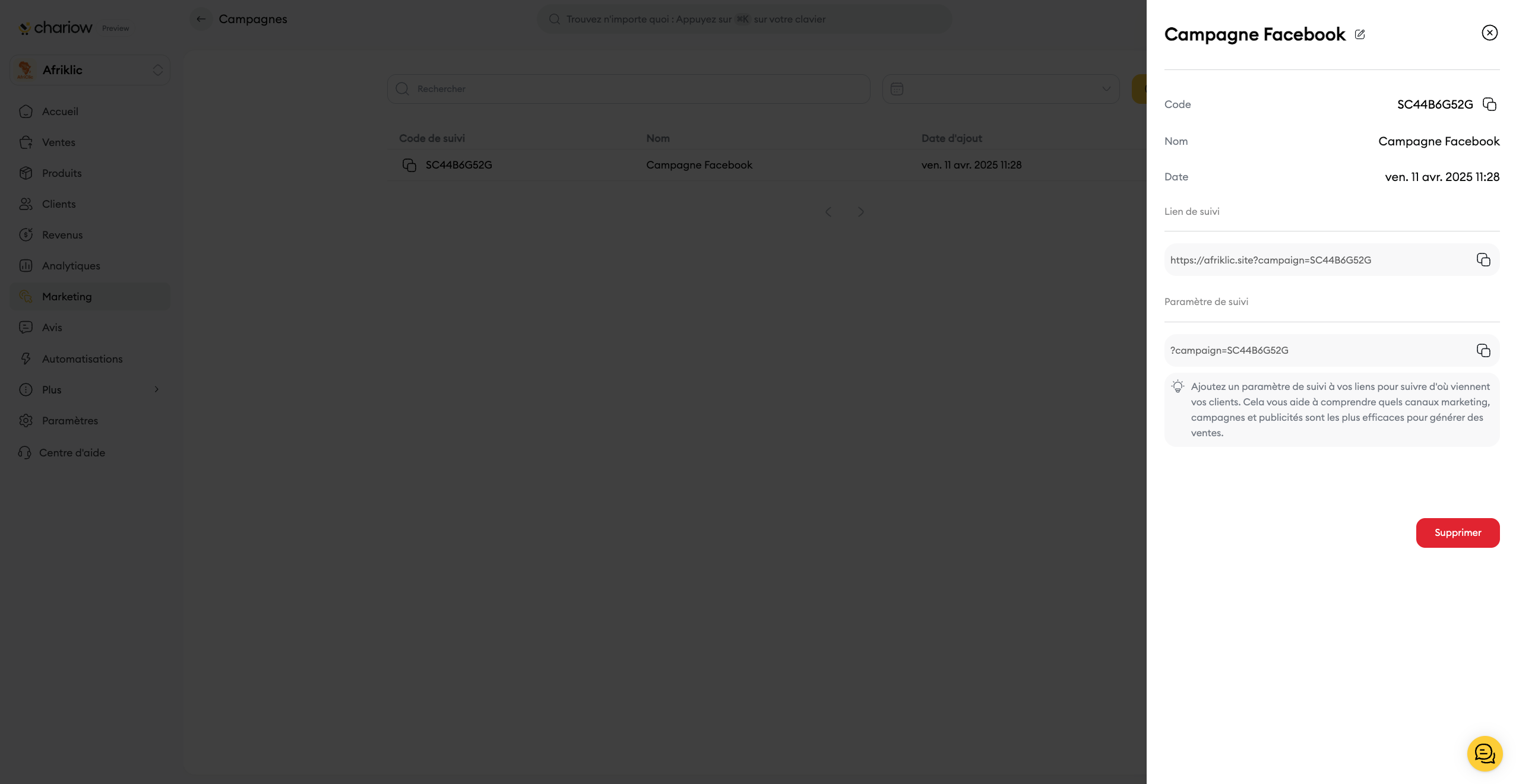 Une campagne marketing sur Chariow n'est pas une campagne en soi, mais un code de suivi associé à votre URL. Ce lien unique est généré pour que vous puissiez identifier l'origine exacte des clients qui visitent votre boutique à partir de vos différentes actions sur les réseaux sociaux. Cela vous permet de savoir d'où vient votre trafic et quelles stratégies fonctionnent le mieux.