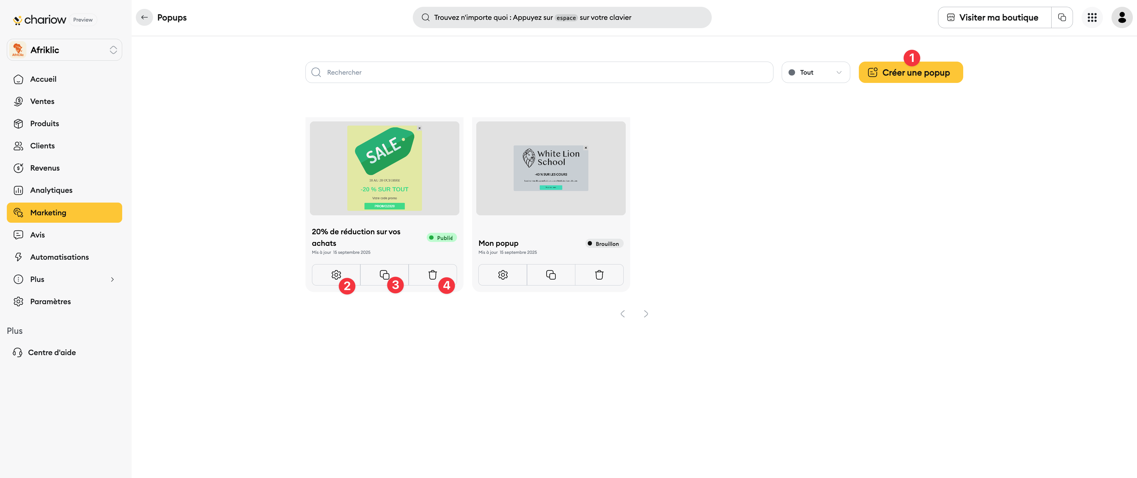 Dans la liste de vos popups, cliquez sur le bouton de configuration (2) pour le popup que vous souhaitez configurer.