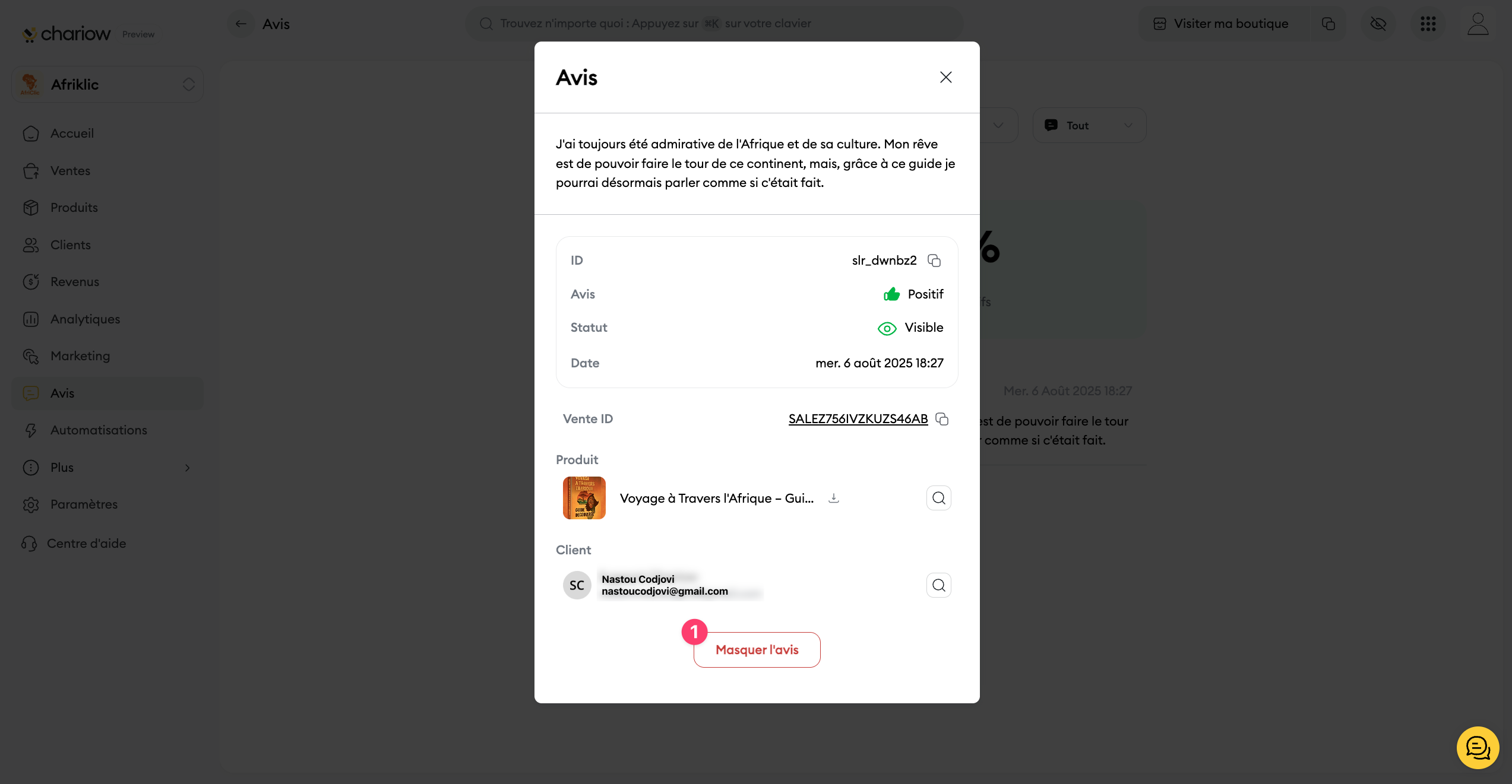 La gestion des avis clients est cruciale pour l'image de votre boutique Chariow vous permet de masquer les avis inappropriés ou non pertinents, ce qui est essentiel pour garder votre espace professionnel et crédible.