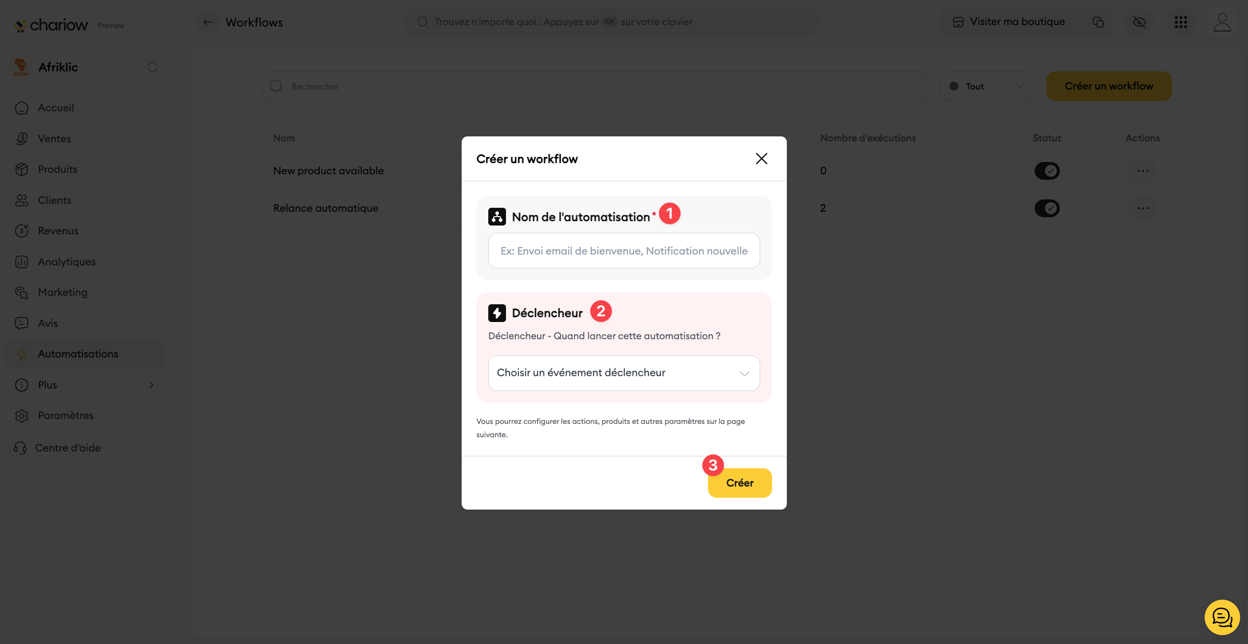 Créer un workflow sur Chariow est un processus simple qui vous permet d'automatiser des tâches marketing et de gestion, comme l'envoi d'e-mails de bienvenue ou la relance de paniers abandonnés.
