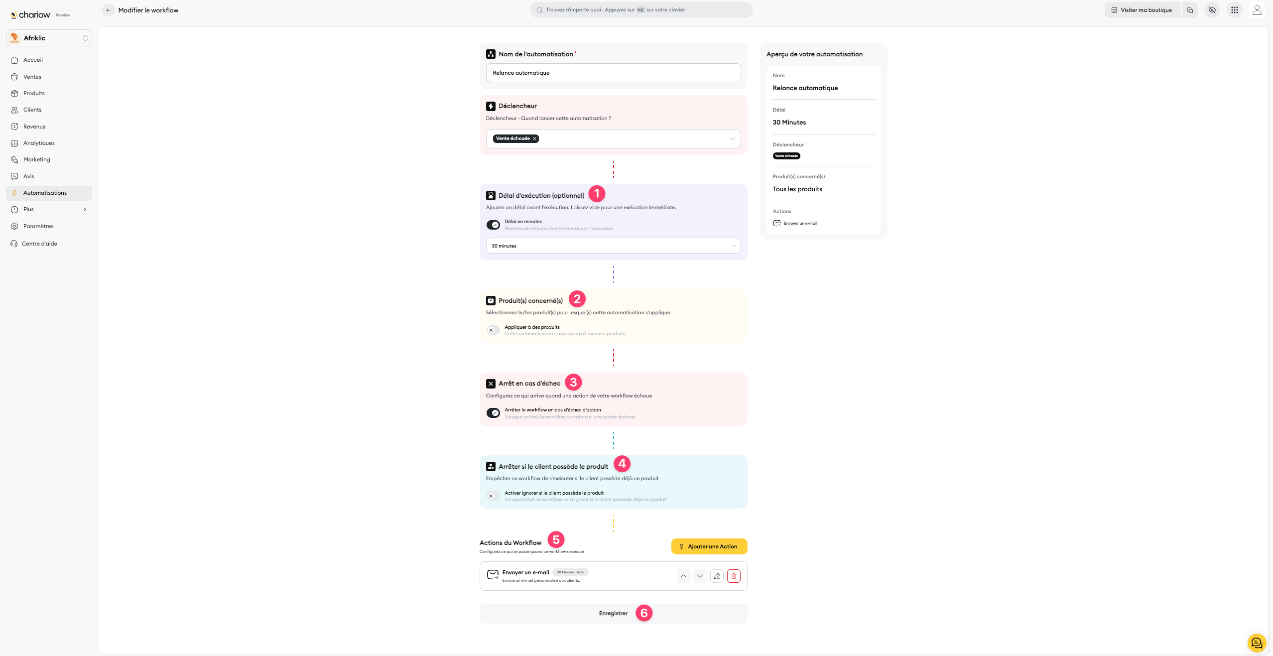 Une fois que vous avez configuré toutes les actions de votre workflow, cliquez sur le bouton Enregistrer (6). Votre workflow est maintenant prêt. Il ne vous reste plus qu'à l'activer sur votre boutique pour qu'il commence à fonctionner.
