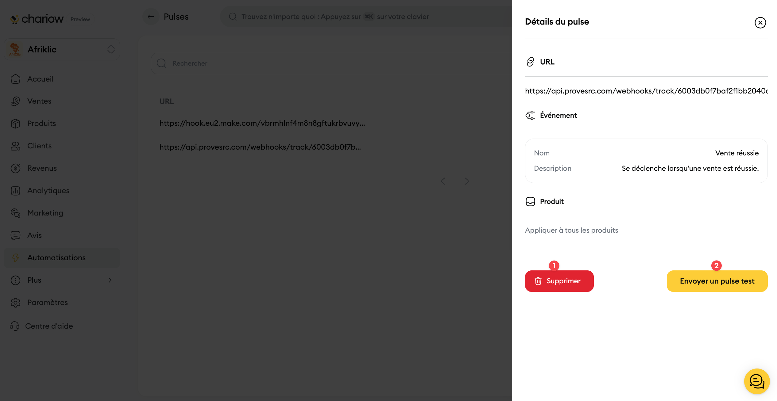 En cliquant sur un pulse dans la liste, une vue détaillée s'affiche sur la droite de l'écran. Vous y trouverez toutes les informations que vous avez configurées : l'URL, l'événement qui le déclenche, et le produit concerné.