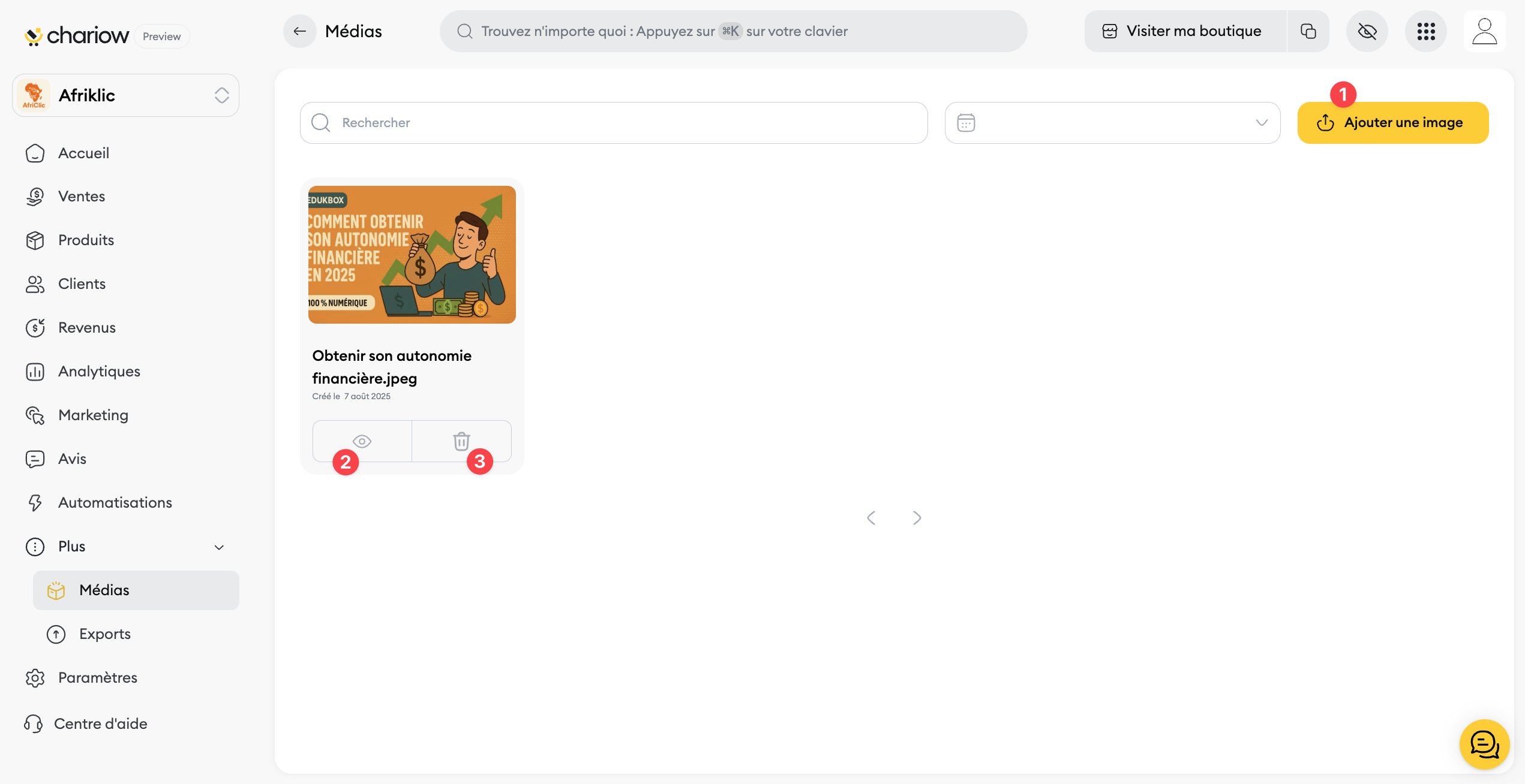 La section Médias de votre tableau de bord Chariow est votre bibliothèque d'images. Vous pouvez y ajouter toutes les images de votre marque pour les retrouver et les utiliser facilement lorsque vous créez vos produits, popups et autres contenus marketing.
