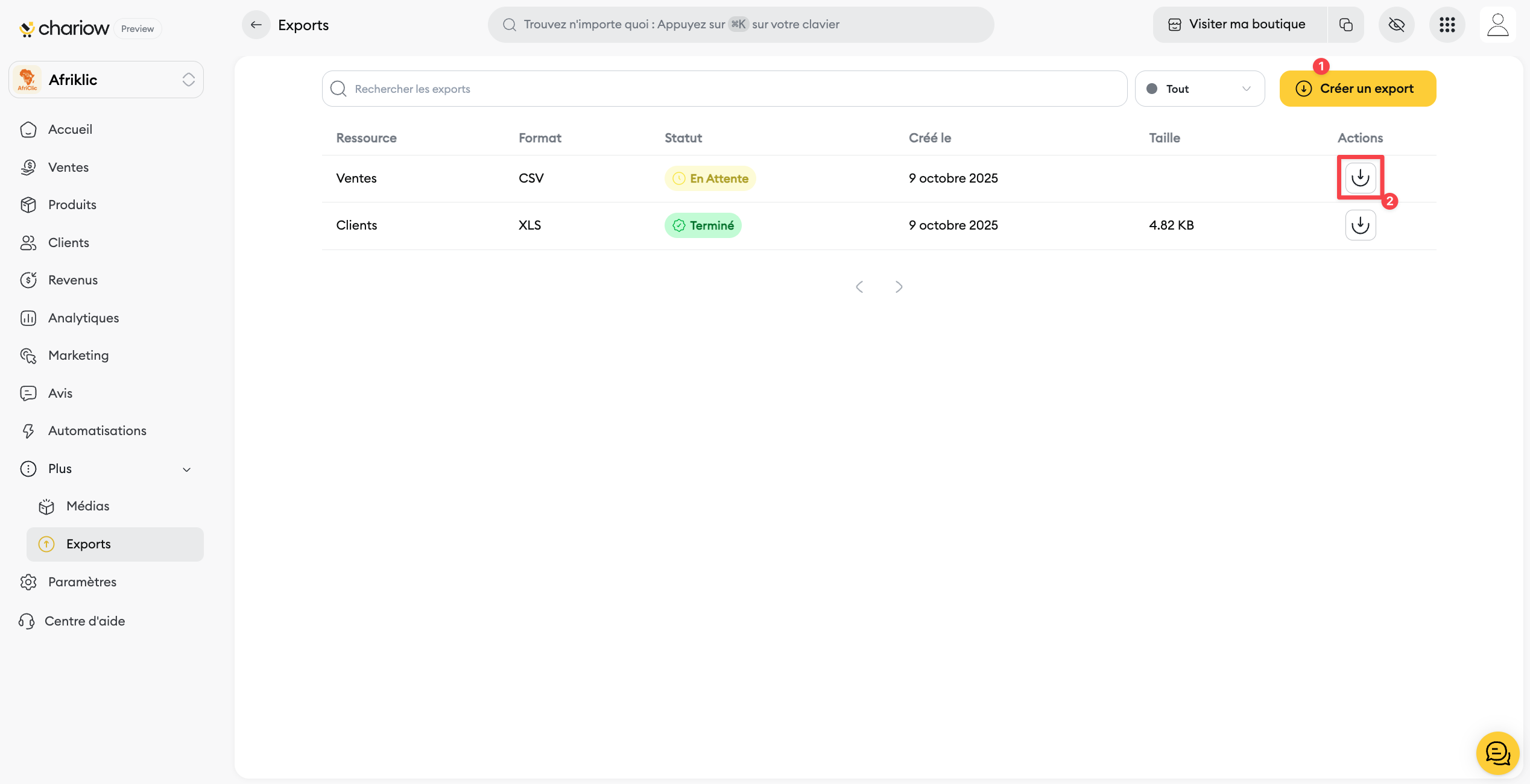 Lorsque le statut de votre export est passé à Terminé, vous pouvez télécharger votre fichier. Pour cela, cliquez simplement sur l'icône de téléchargement (2) dans la colonne Actions.