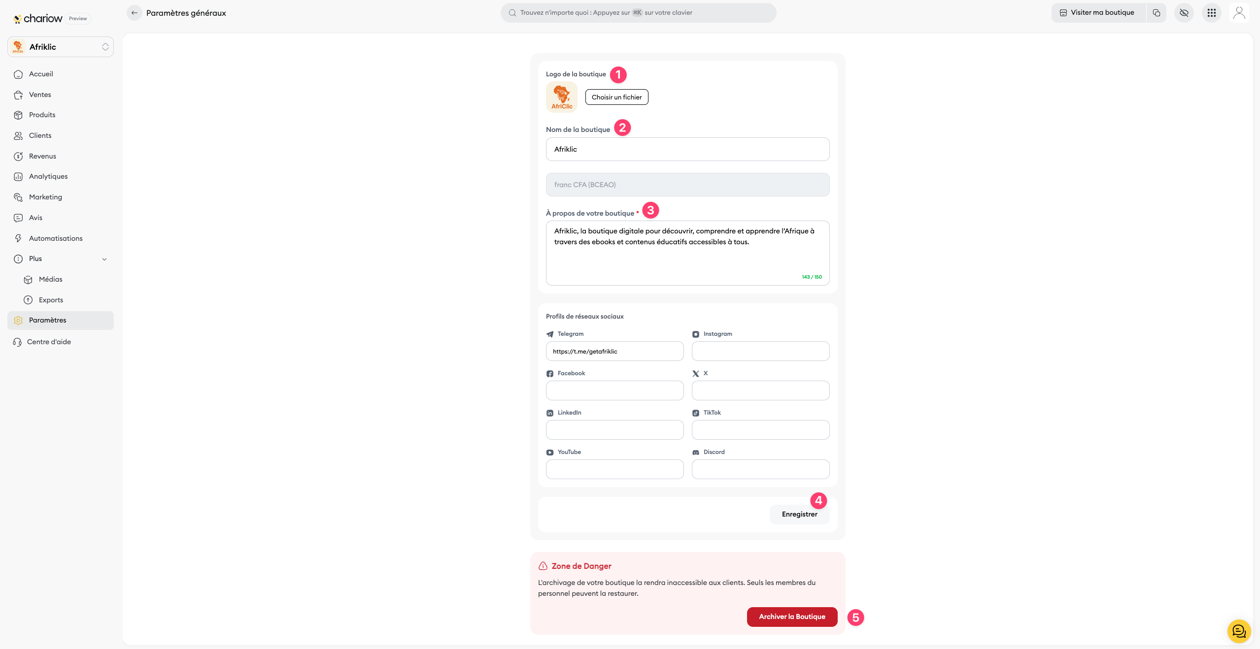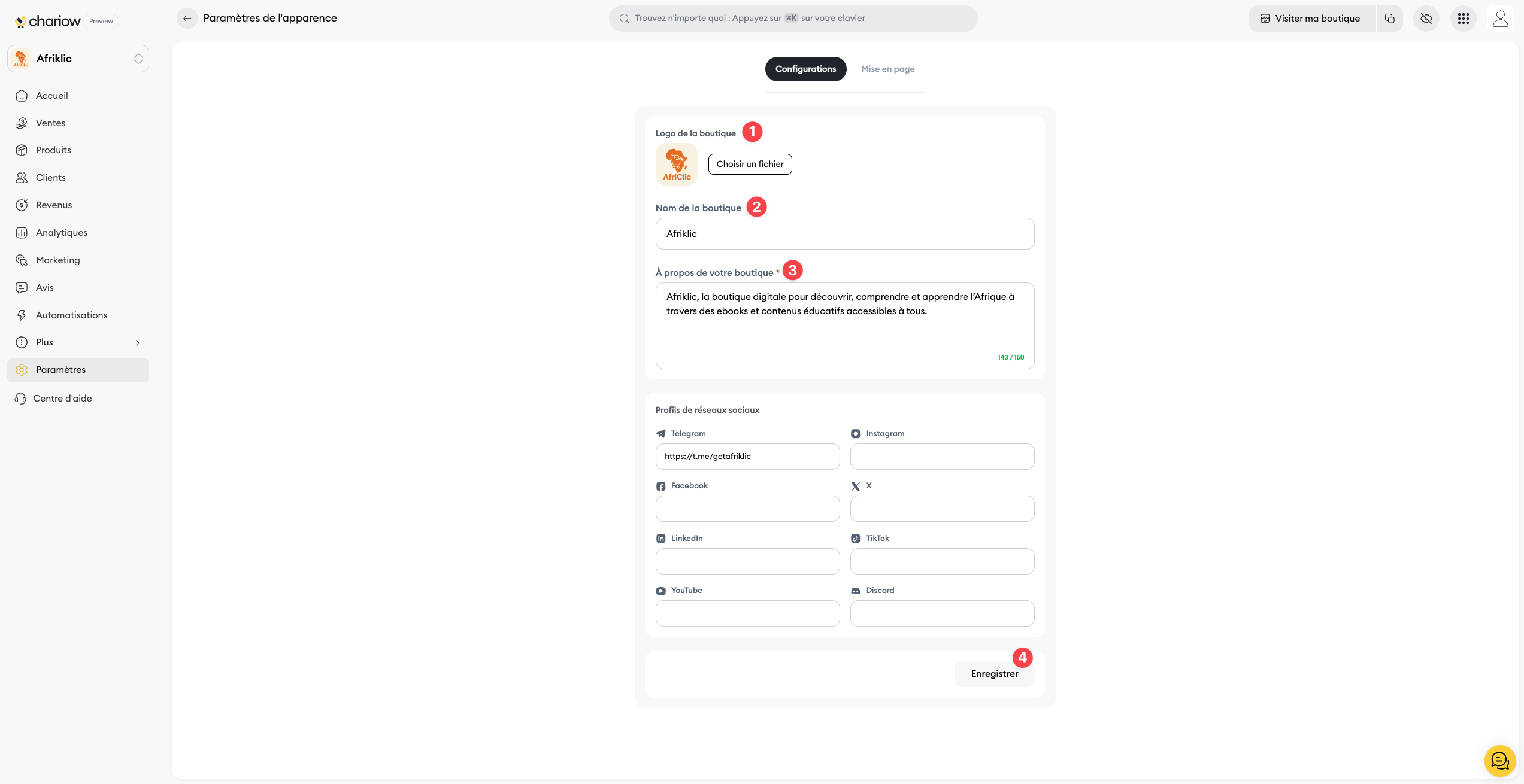 À propos de ta boutique (3) : Rédige ou modifie la description de ta boutique. C’est l’occasion parfaite pour présenter tes produits ou ta mission aux visiteurs.
