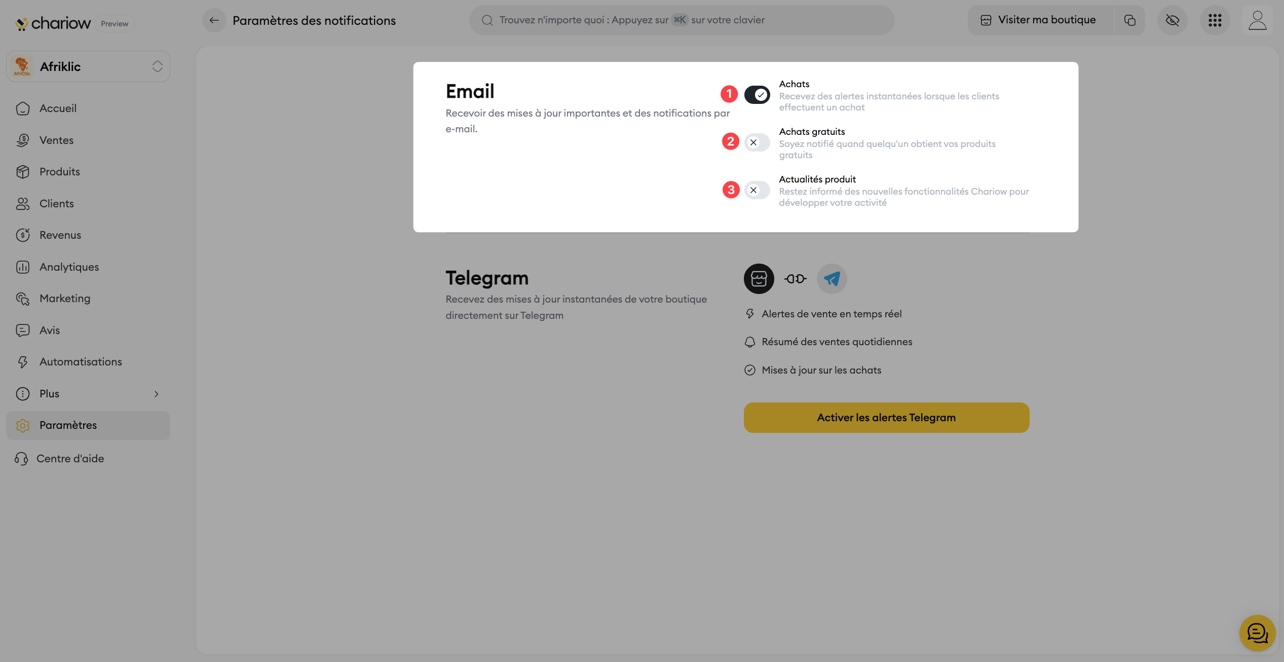 Actualités produit (3) : Activez cette option pour recevoir des informations sur les nouvelles fonctionnalités de Chariow.
