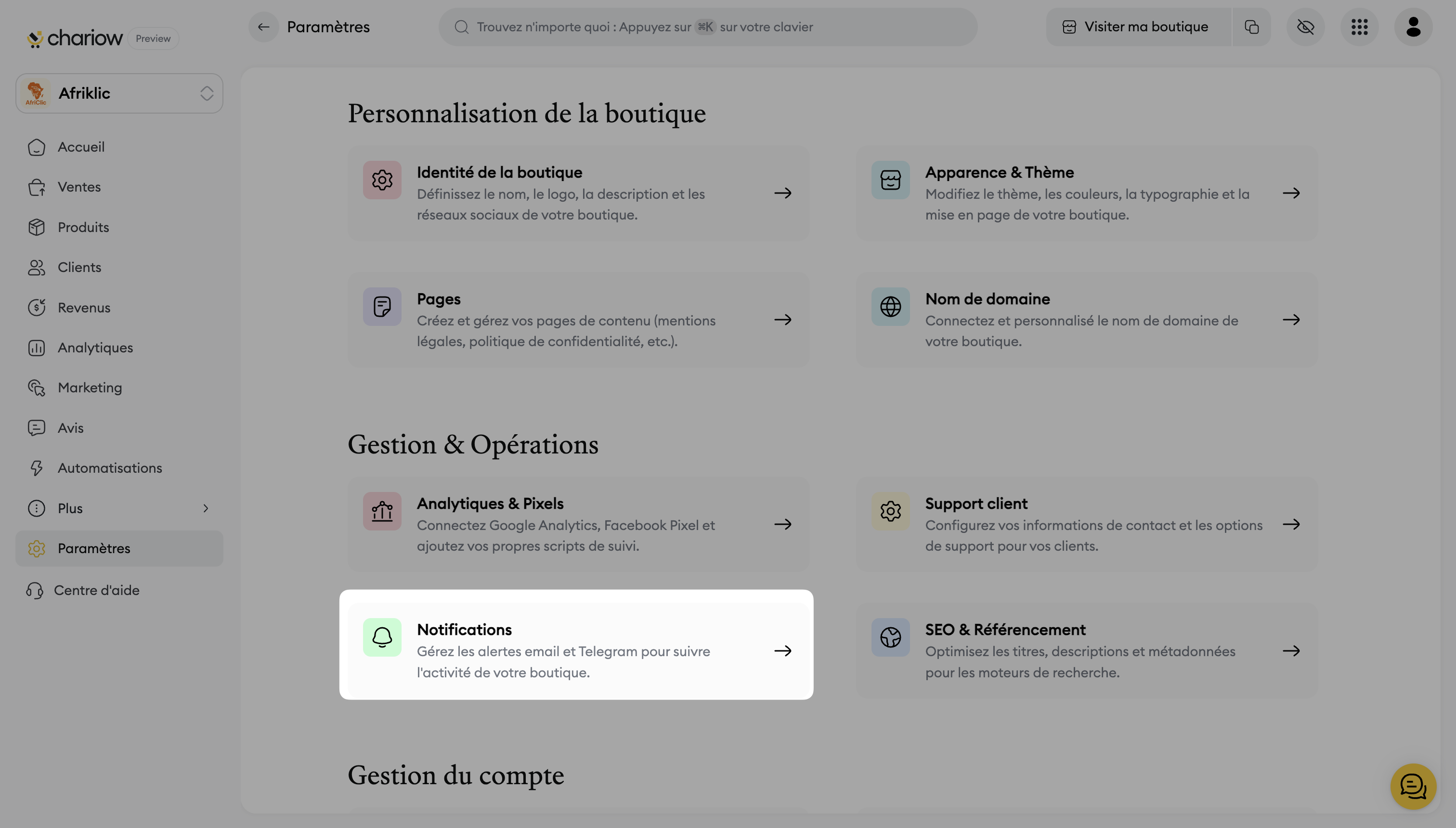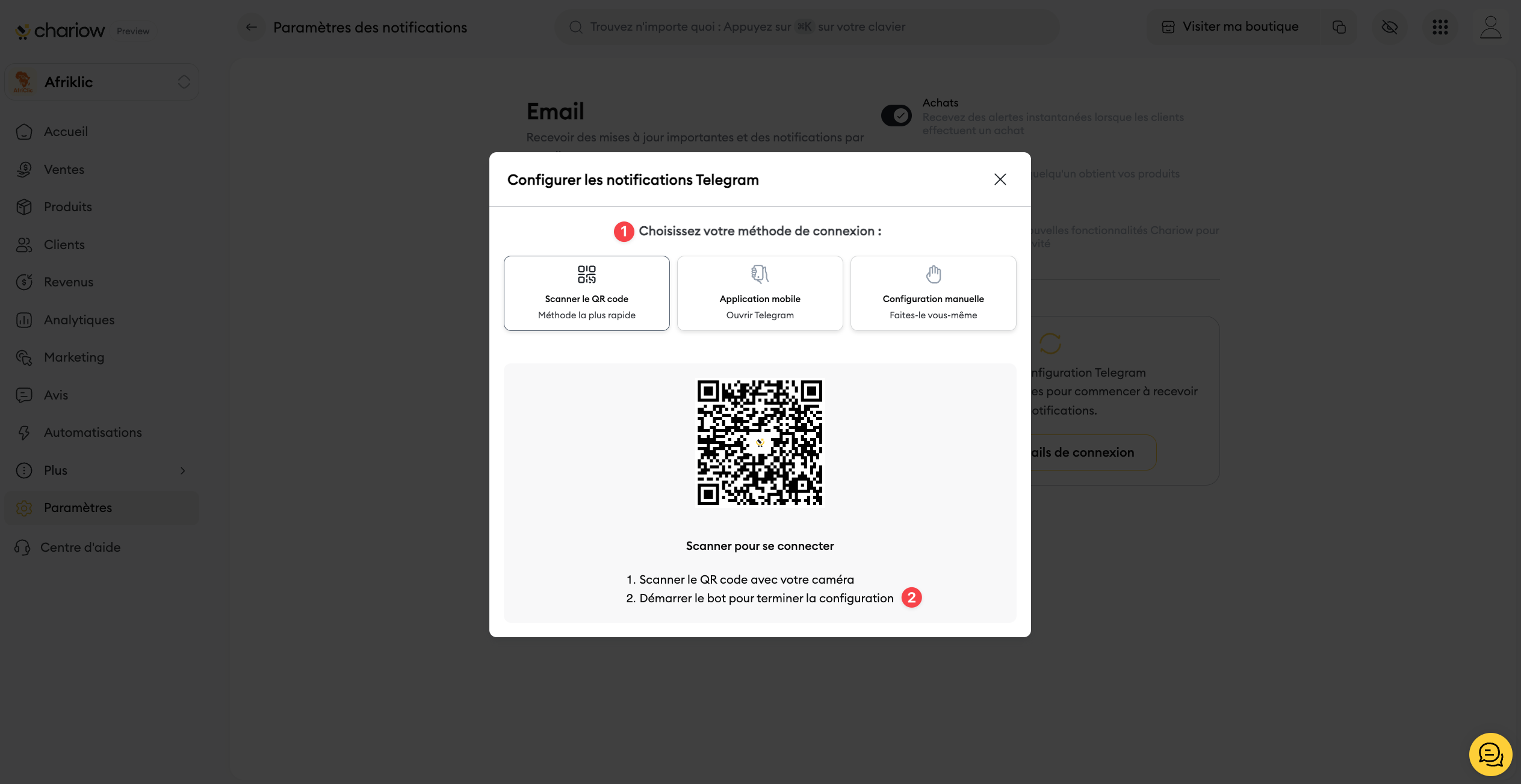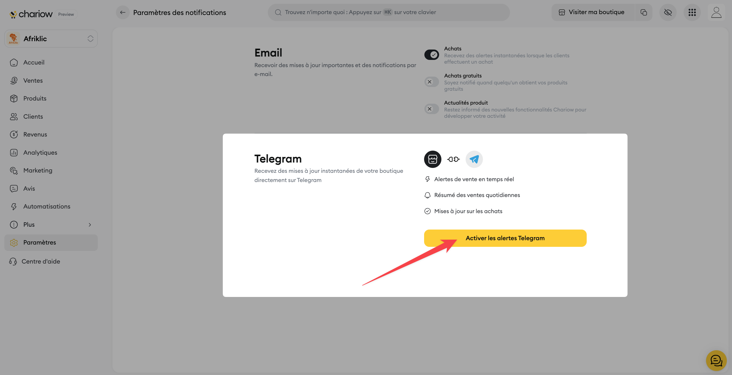 Le bot Telegram de Chariow vous permet de recevoir des mises à jour instantanées de votre boutique (alertes de vente, résumés quotidiens) directement sur votre téléphone. C'est l'outil idéal pour suivre votre activité en temps réel.