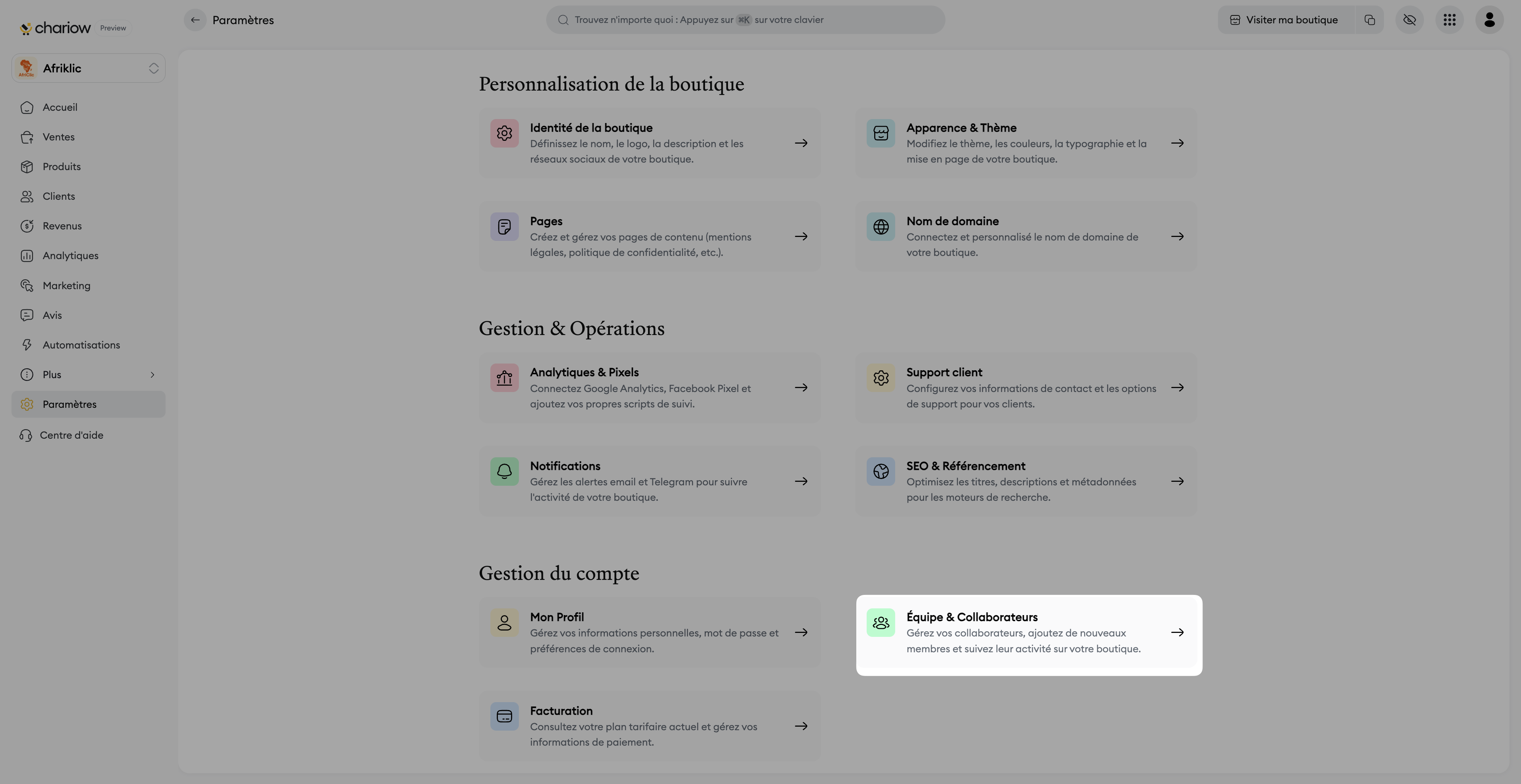 Depuis votre tableau de bord, allez dans la section Paramètres.