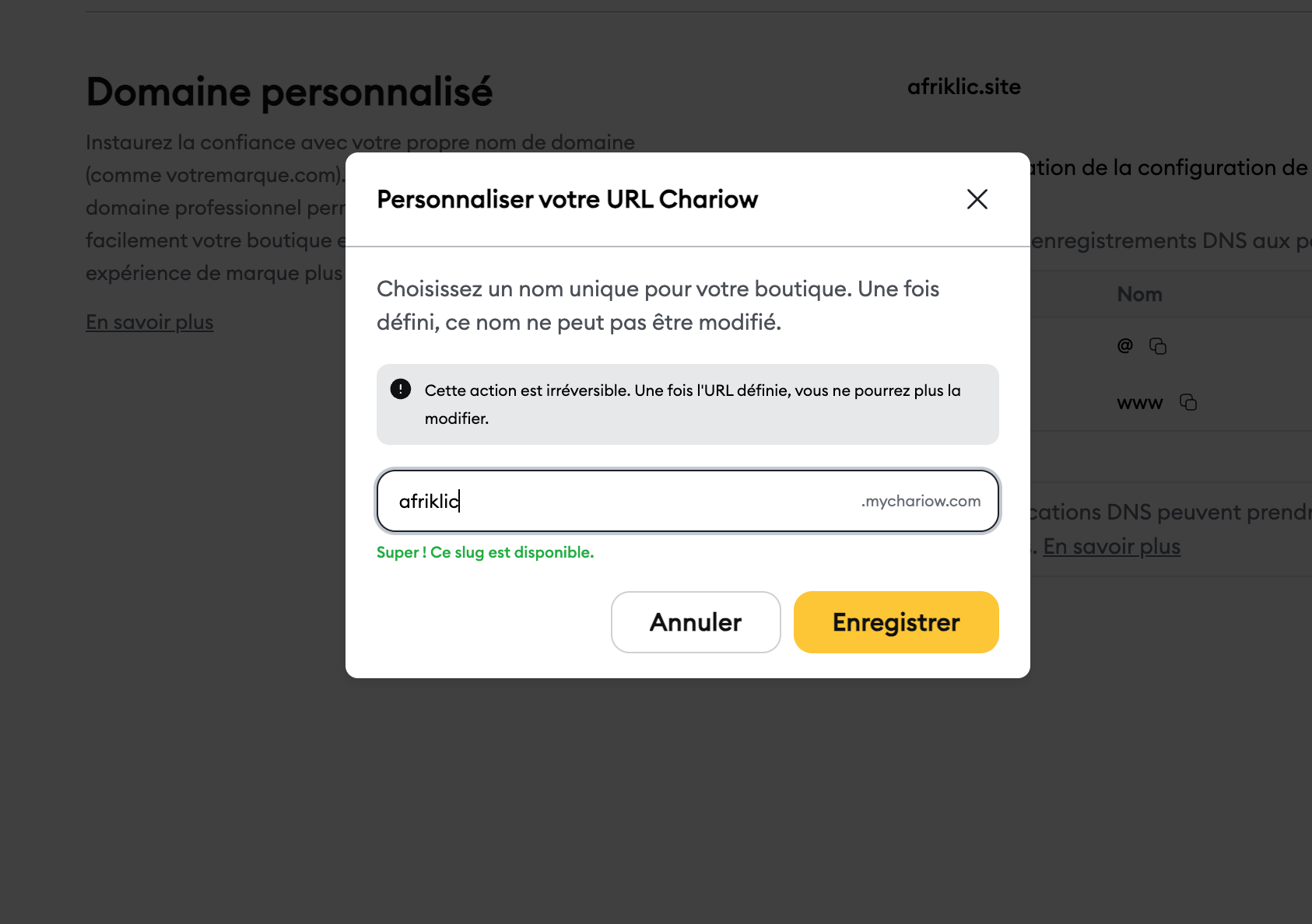 Dans le champ prévu, ajoutez le slug que vous souhaitez attribuer à votre URL (par exemple, afriklic).