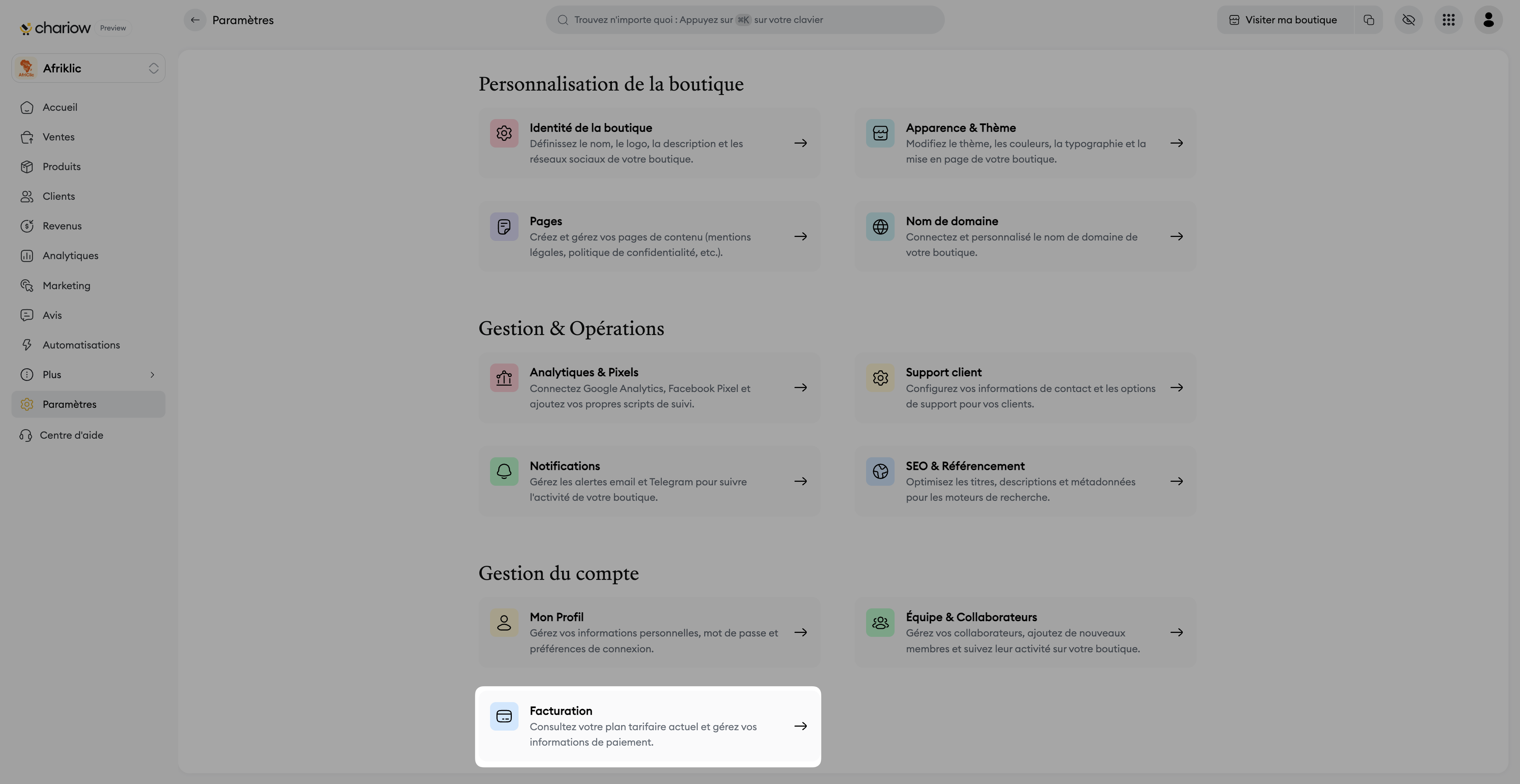 Pour vos débuts sur Chariow, votre boutique opère sous le plan Starter.