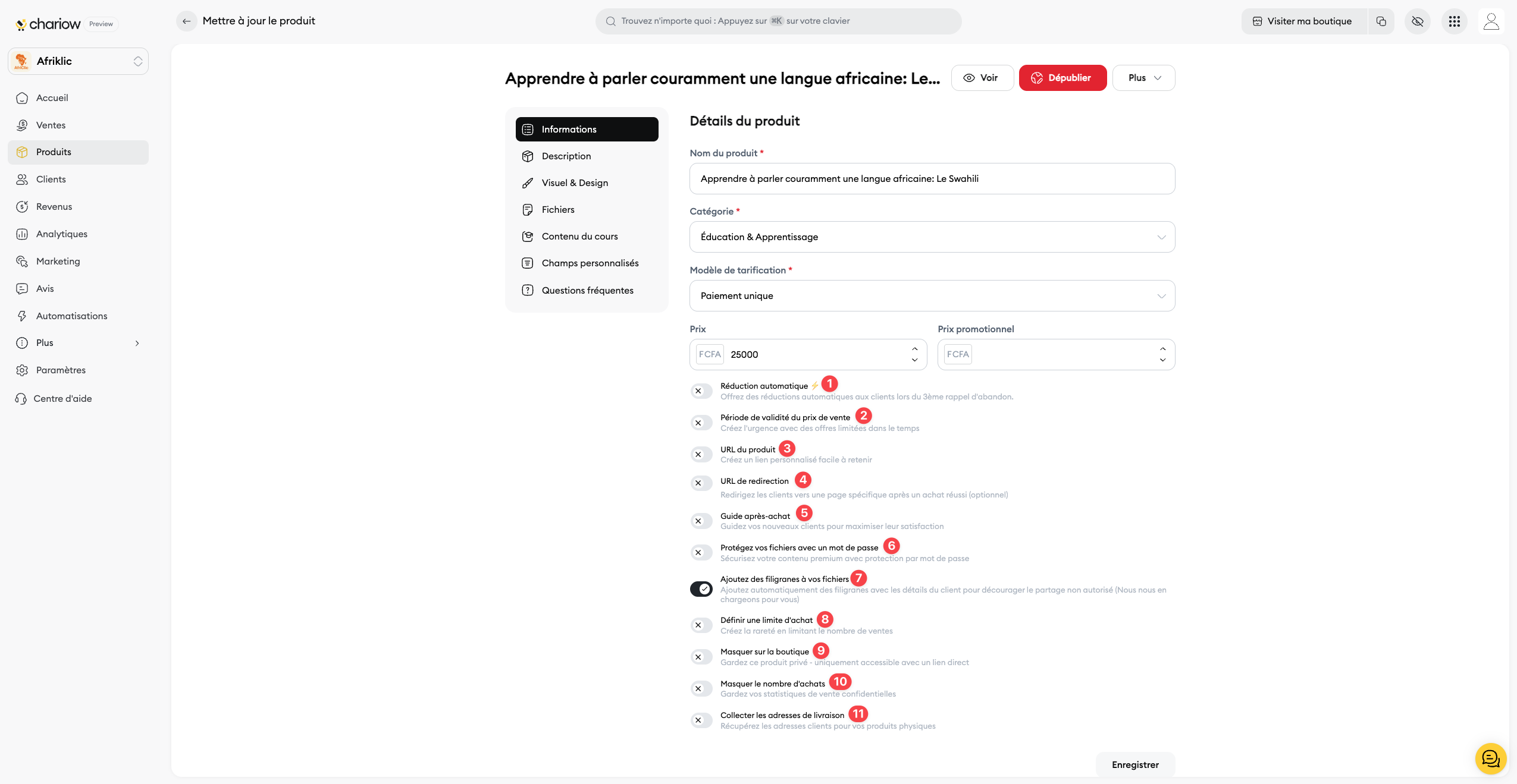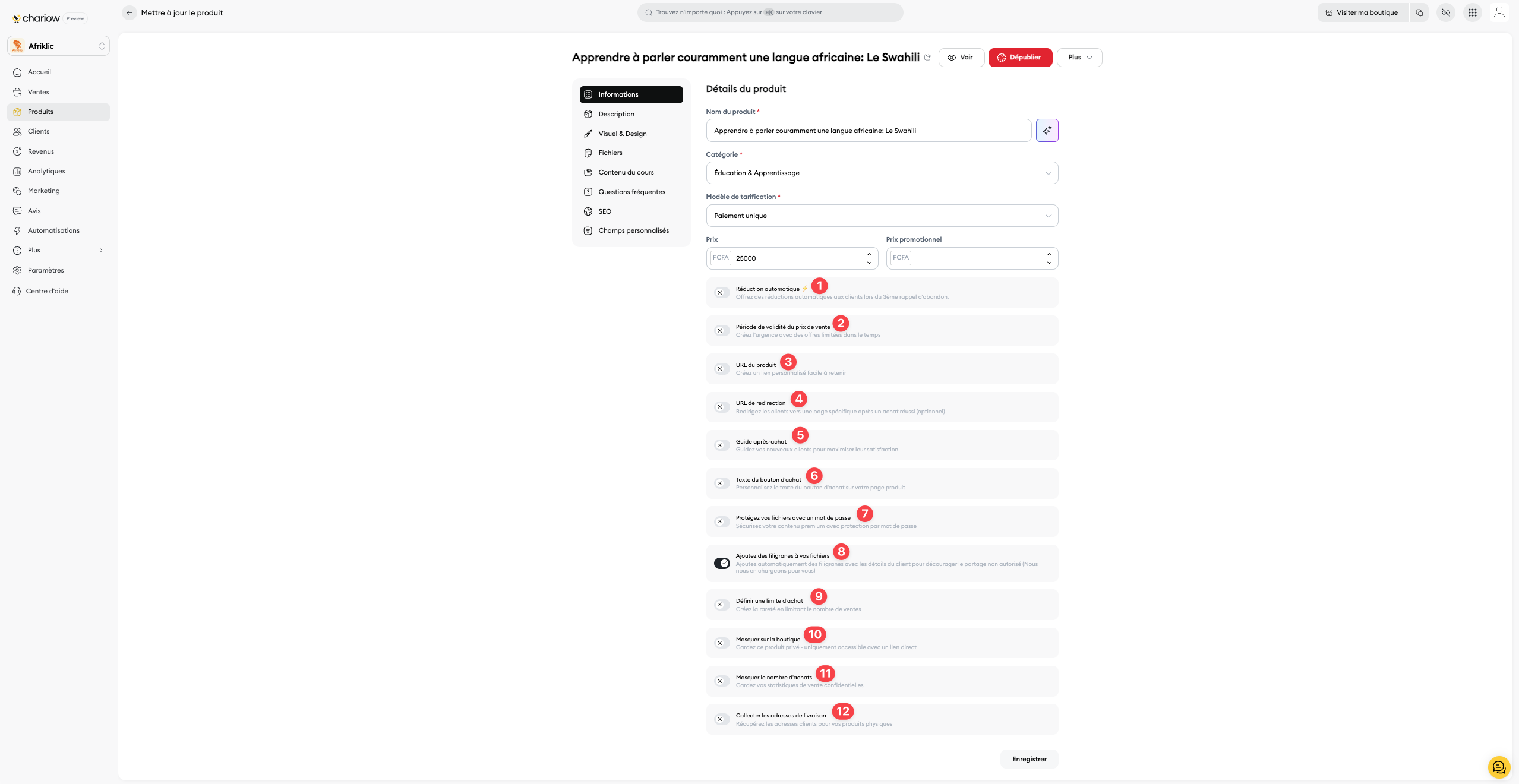 Une fois votre cours créé, vous pouvez le personnaliser en activant différentes fonctionnalités pour optimiser l'expérience d'apprentissage et la gestion de vos ventes. Voici un aperçu des options disponibles sur la page des détails du produit.