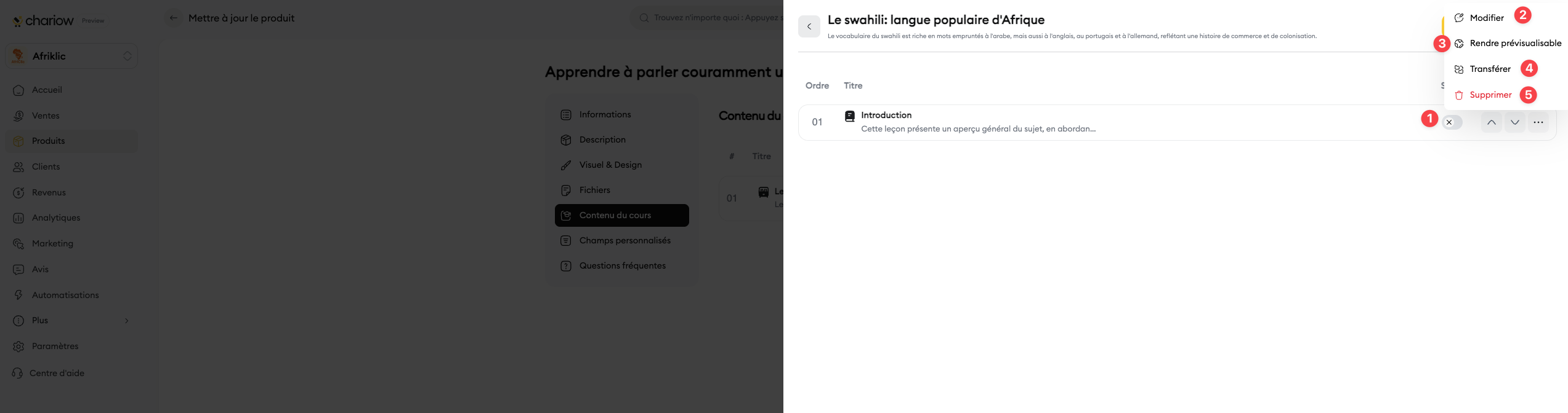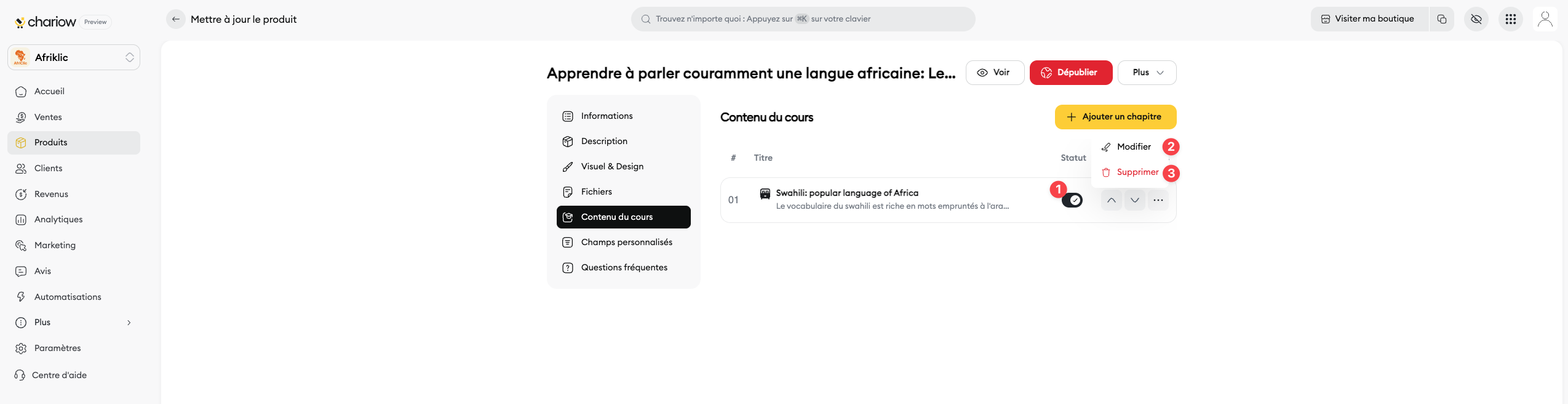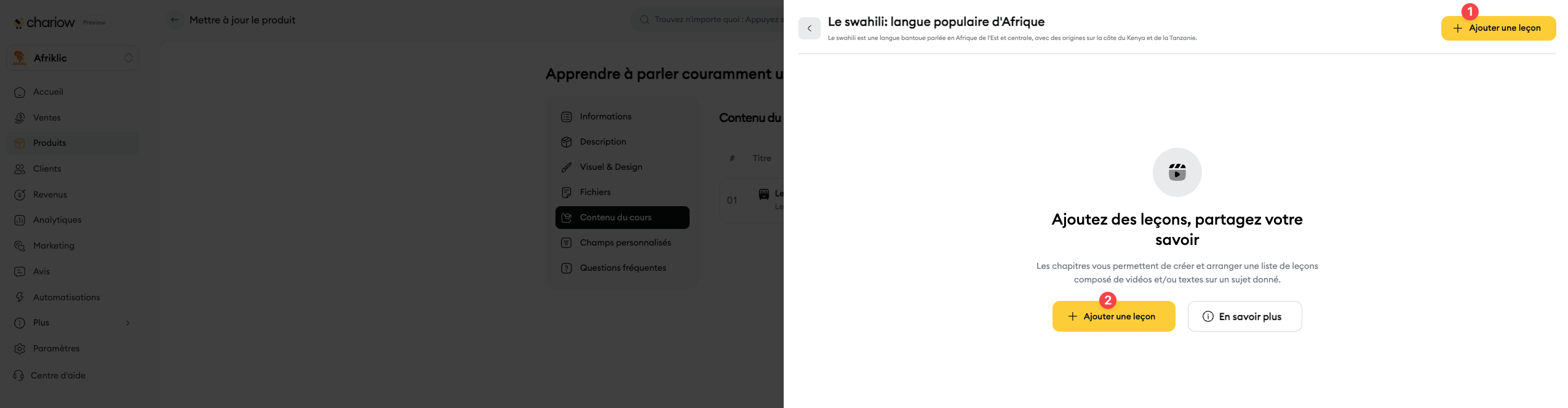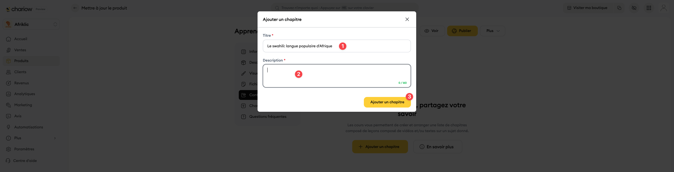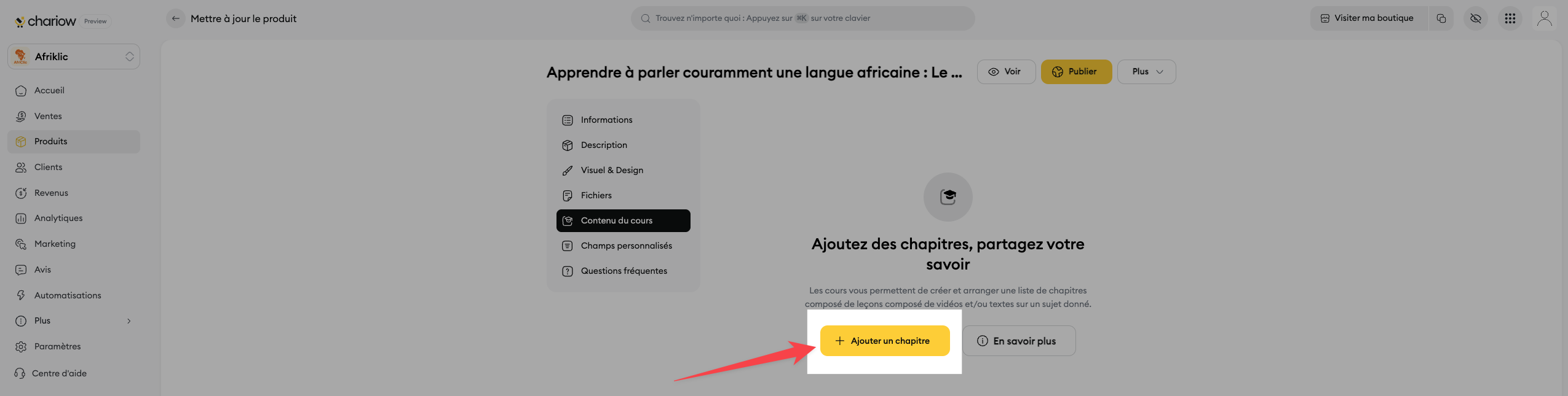 Le contenu est au cœur de votre formation. Pour offrir une expérience d'apprentissage complète, Chariow vous permet d'organiser et d'enrichir votre cours avec des chapitres et des leçons. Voici comment procéder pour structurer votre contenu de manière efficace.