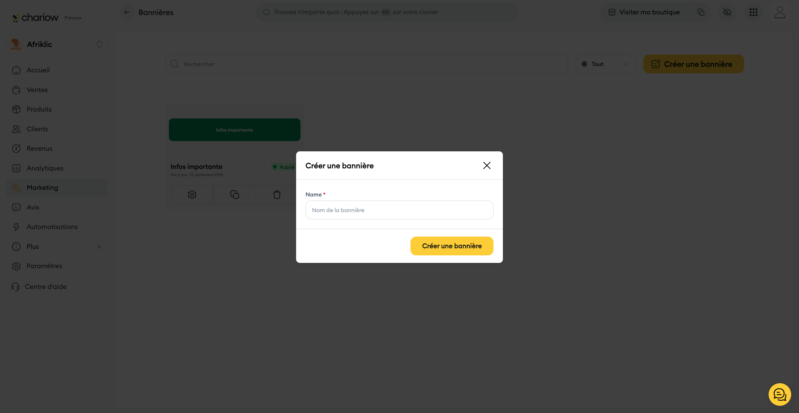 Depuis votre tableau de bord Chariow, allez dans Marketing, puis cliquez sur Bannières.