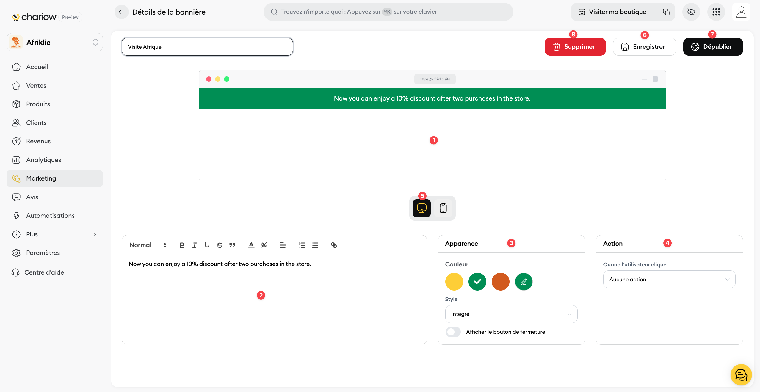 Publier (7) : Cliquez sur le bouton Publier (7) pour rendre la bannière visible sur votre boutique.