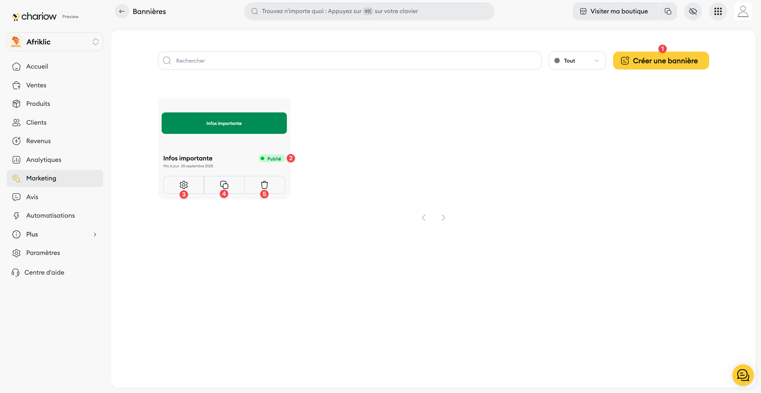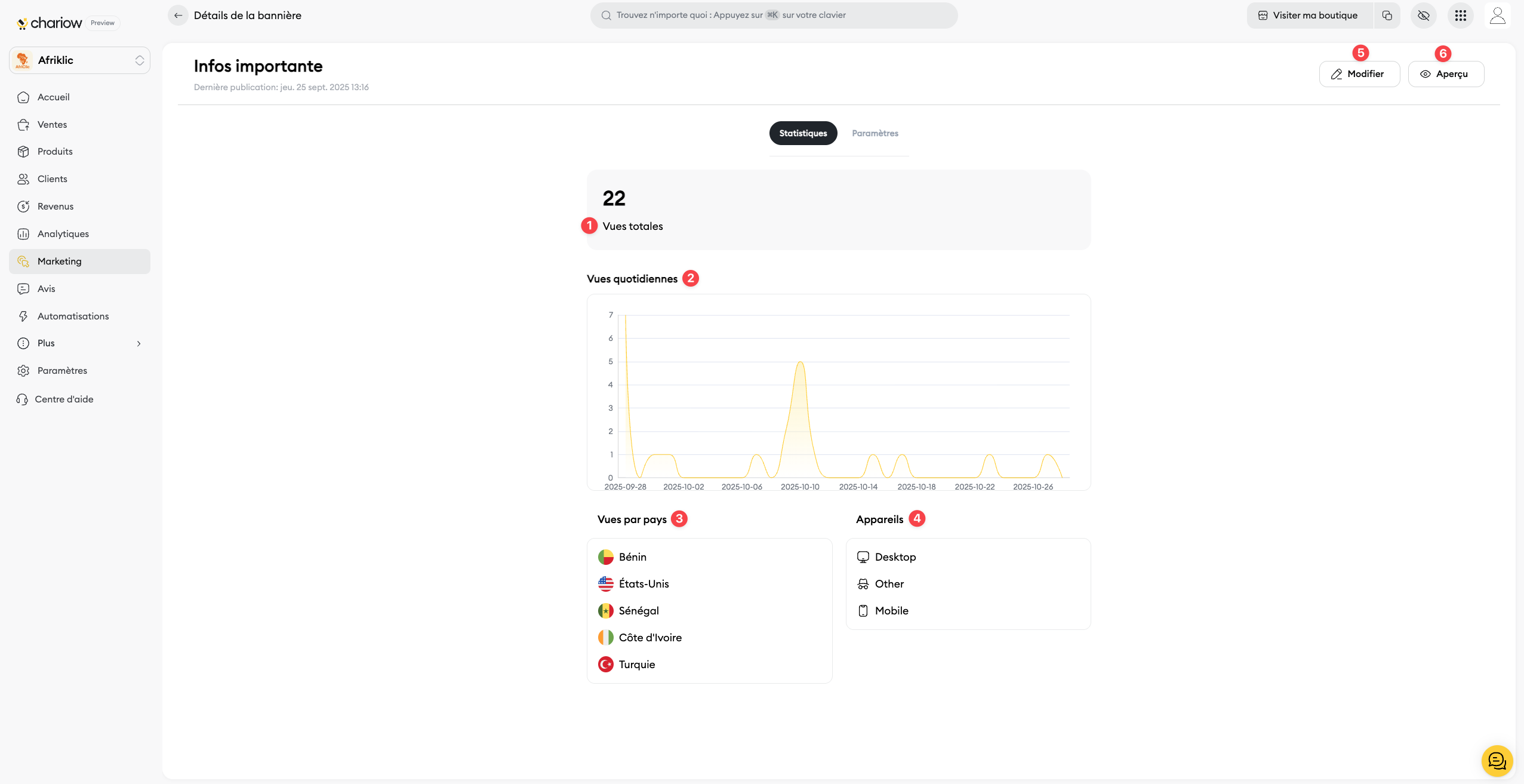 Une fois que votre bannière est publiée, il est crucial de suivre ses performances pour mesurer son efficacité et optimiser vos messages. Chariow vous fournit des outils d'analyse pour vous aider à comprendre comment vos visiteurs interagissent avec votre bannière.