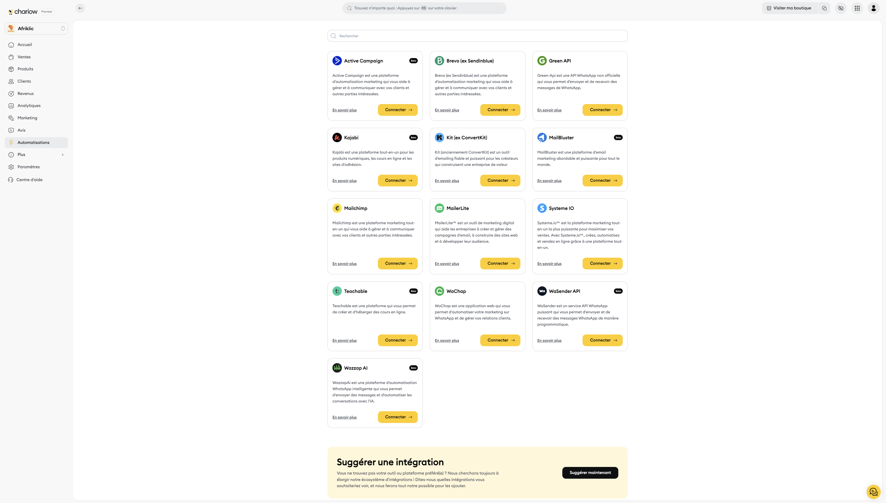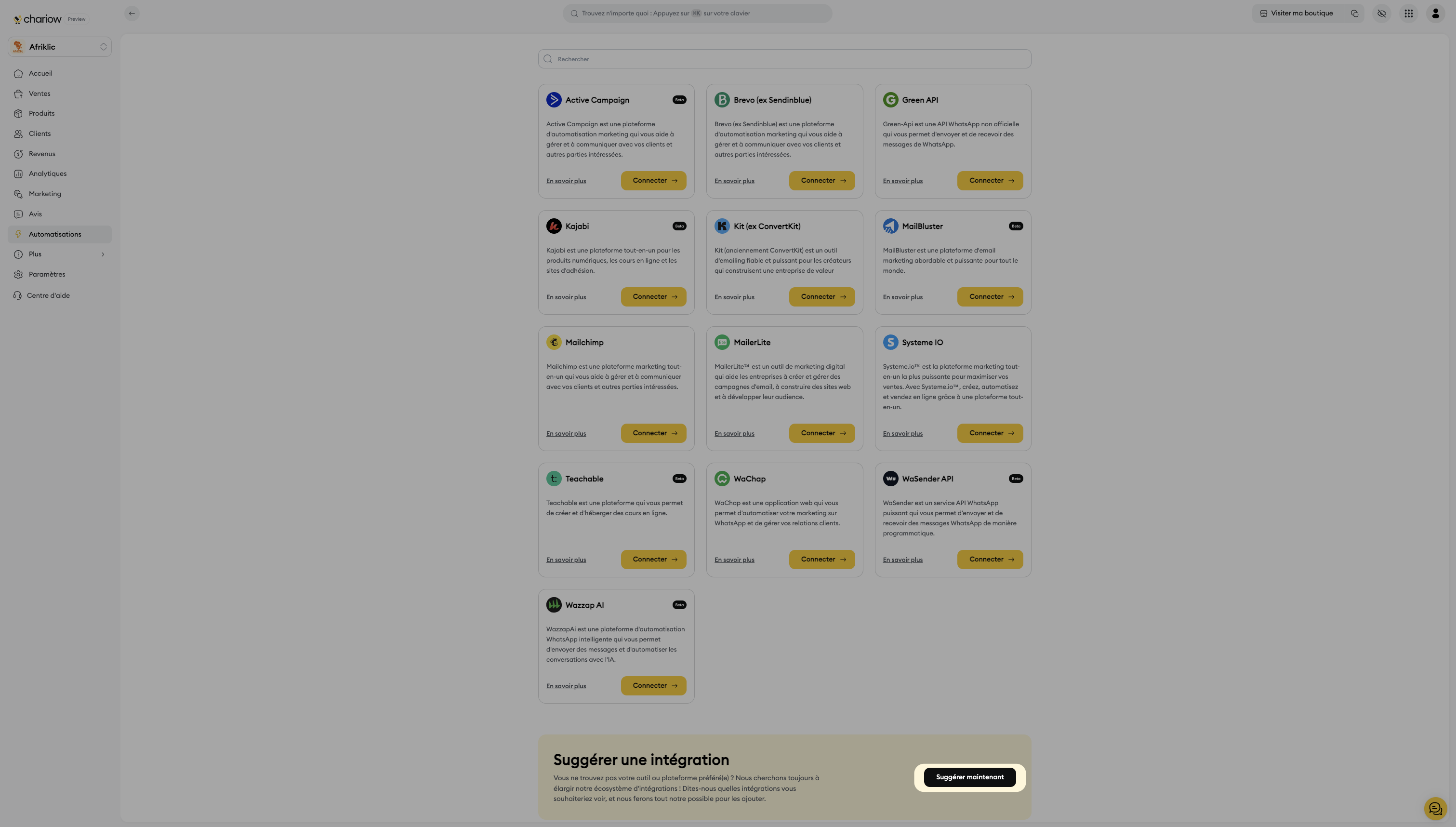 Ajouter une intégration sur votre boutique Chariow vous permet de connecter vos outils préférés pour automatiser des tâches. Cela vous permet d’optimiser la gestion de vos clients et de vos campagnes. Vous gagnez ainsi du temps pour développer votre entreprise plus efficacement.