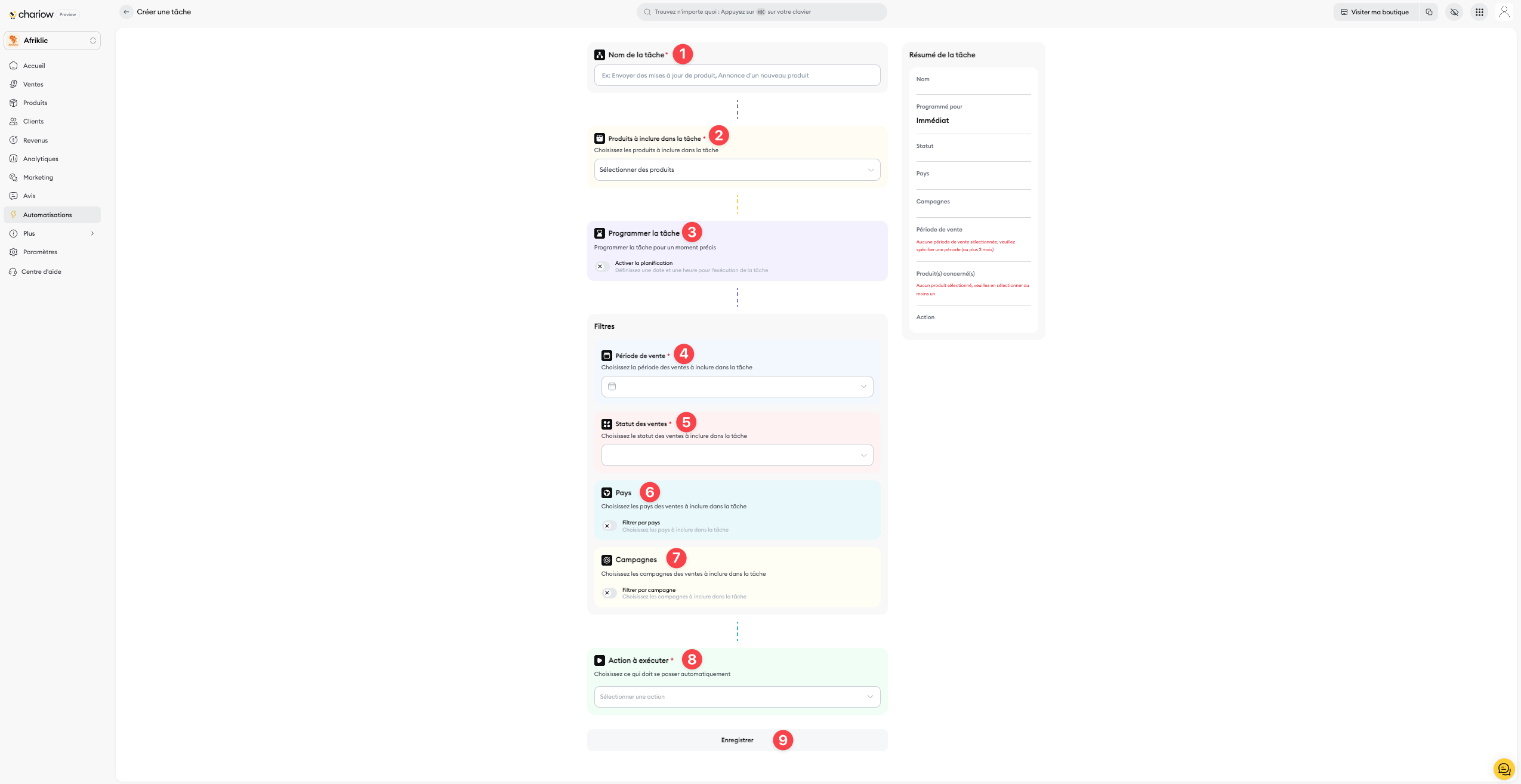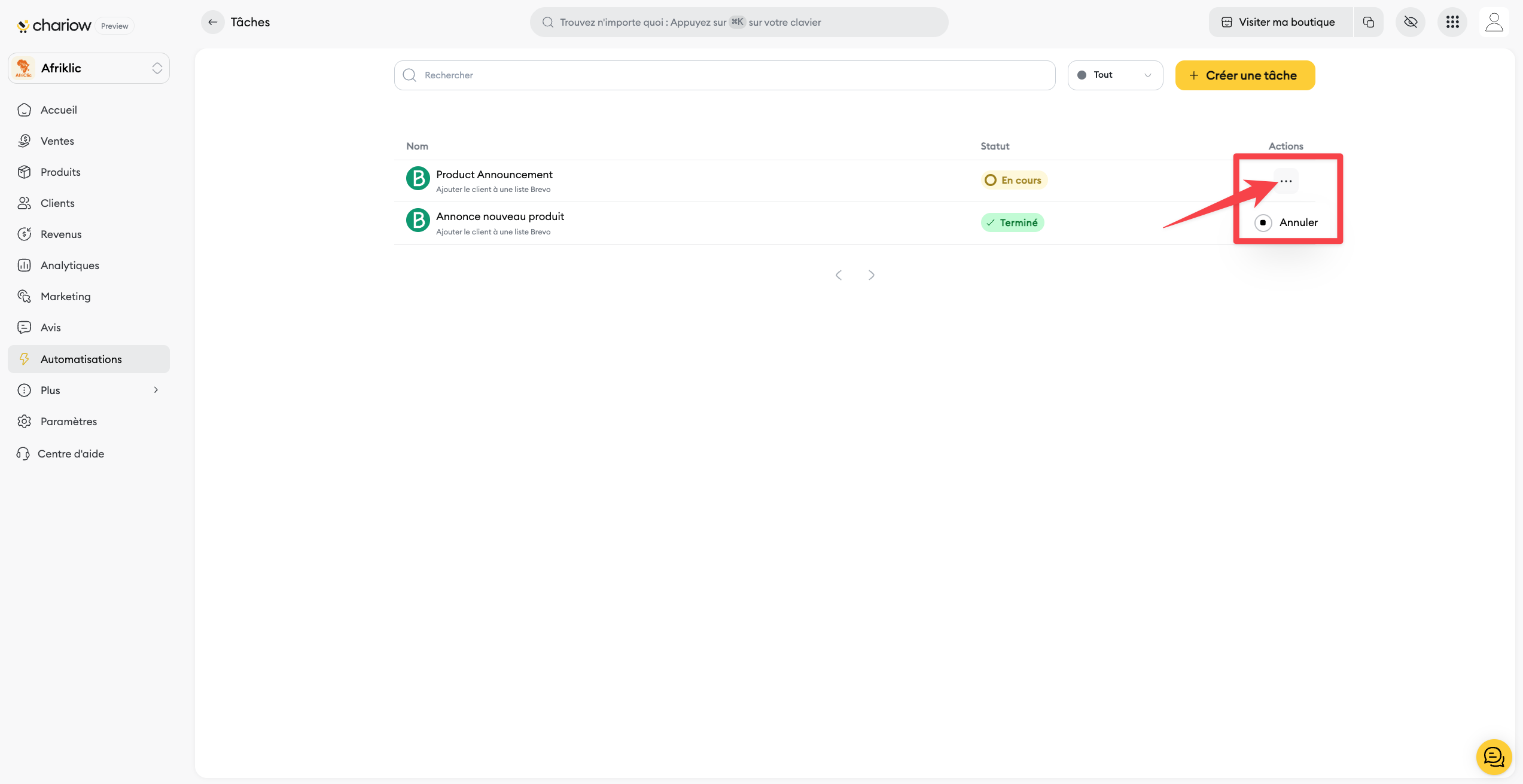 Depuis votre tableau de bord, allez dans Automatisations, puis cliquez sur Tâches.