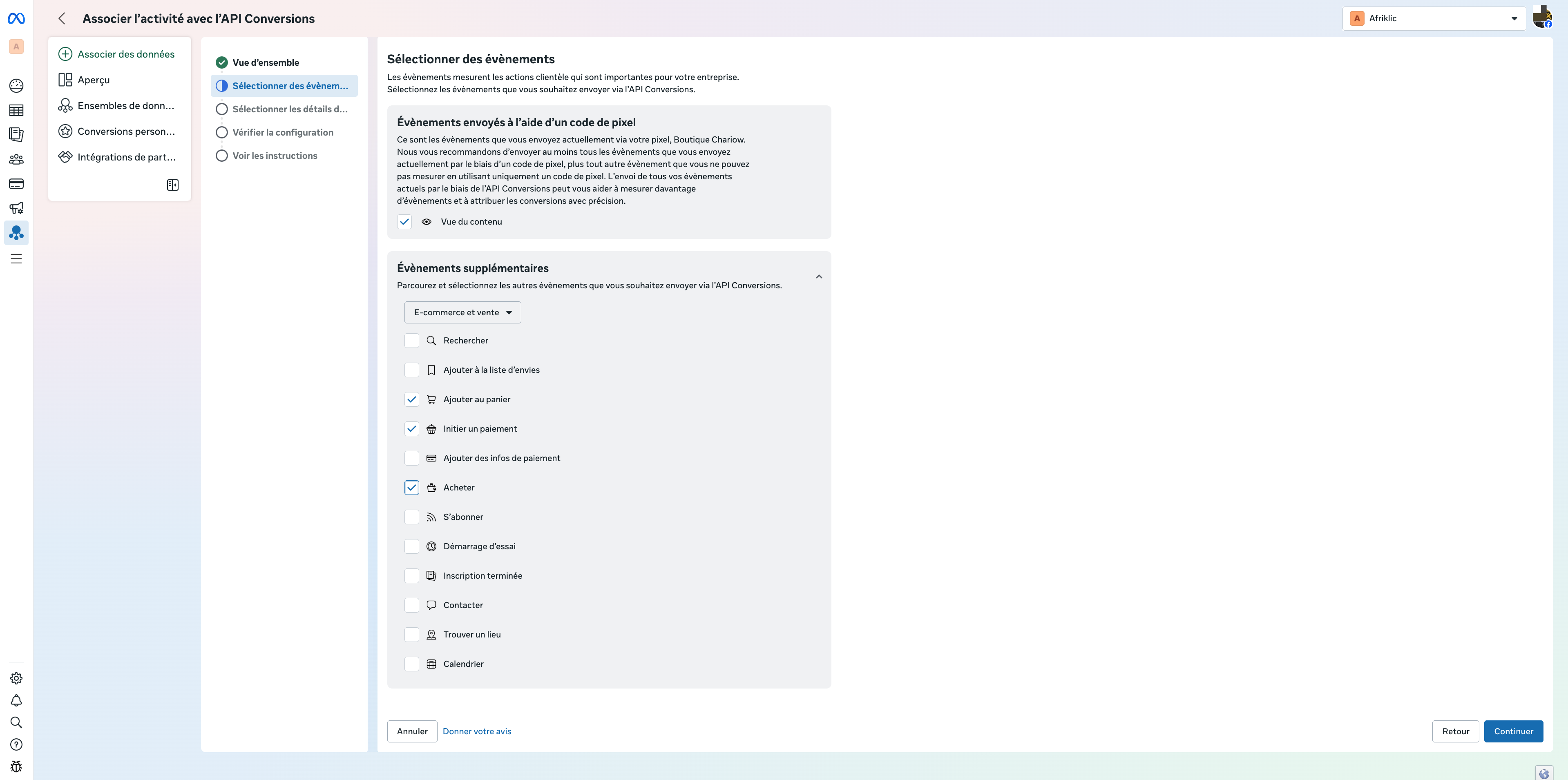Sélectionnez les événements que vous souhaitez envoyer via l'API de conversions. Utilisez le menu déroulant pour obtenir des recommandations d'événements, puis cliquez sur Continuer.