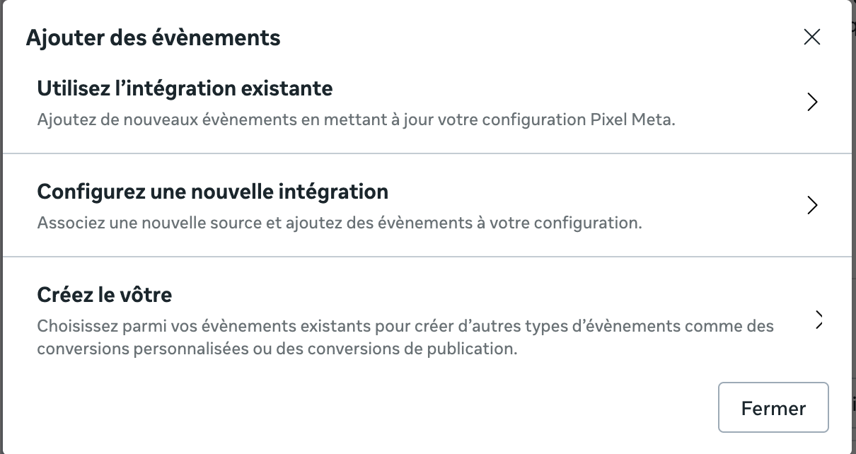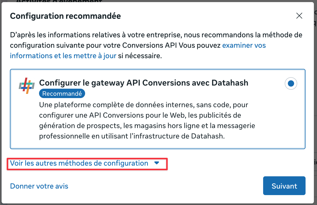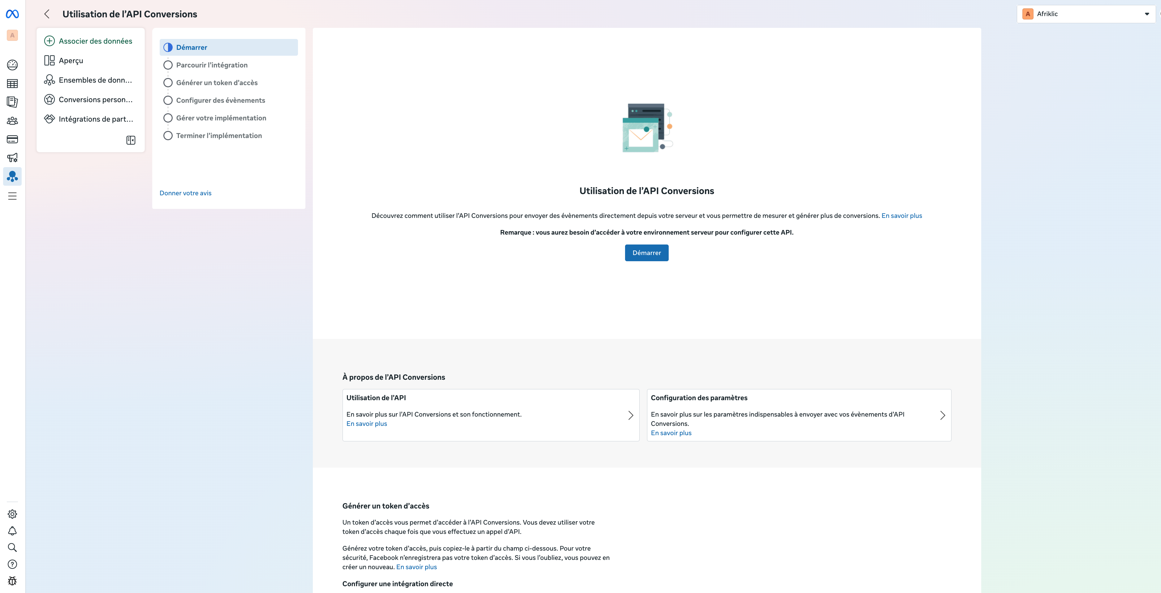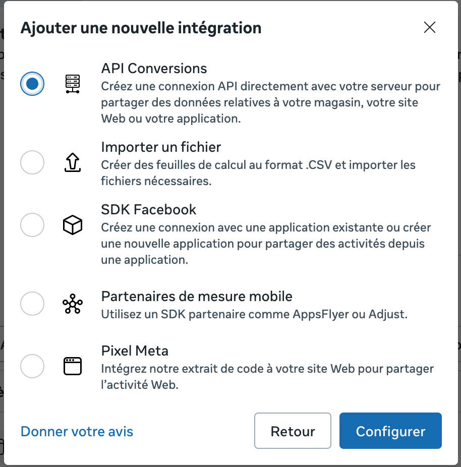 Dans la fenêtre qui s’affiche, choisissez Configurer une nouvelle intégration, ensuite sélectionnez API Conversions et cliquez sur Configurer.