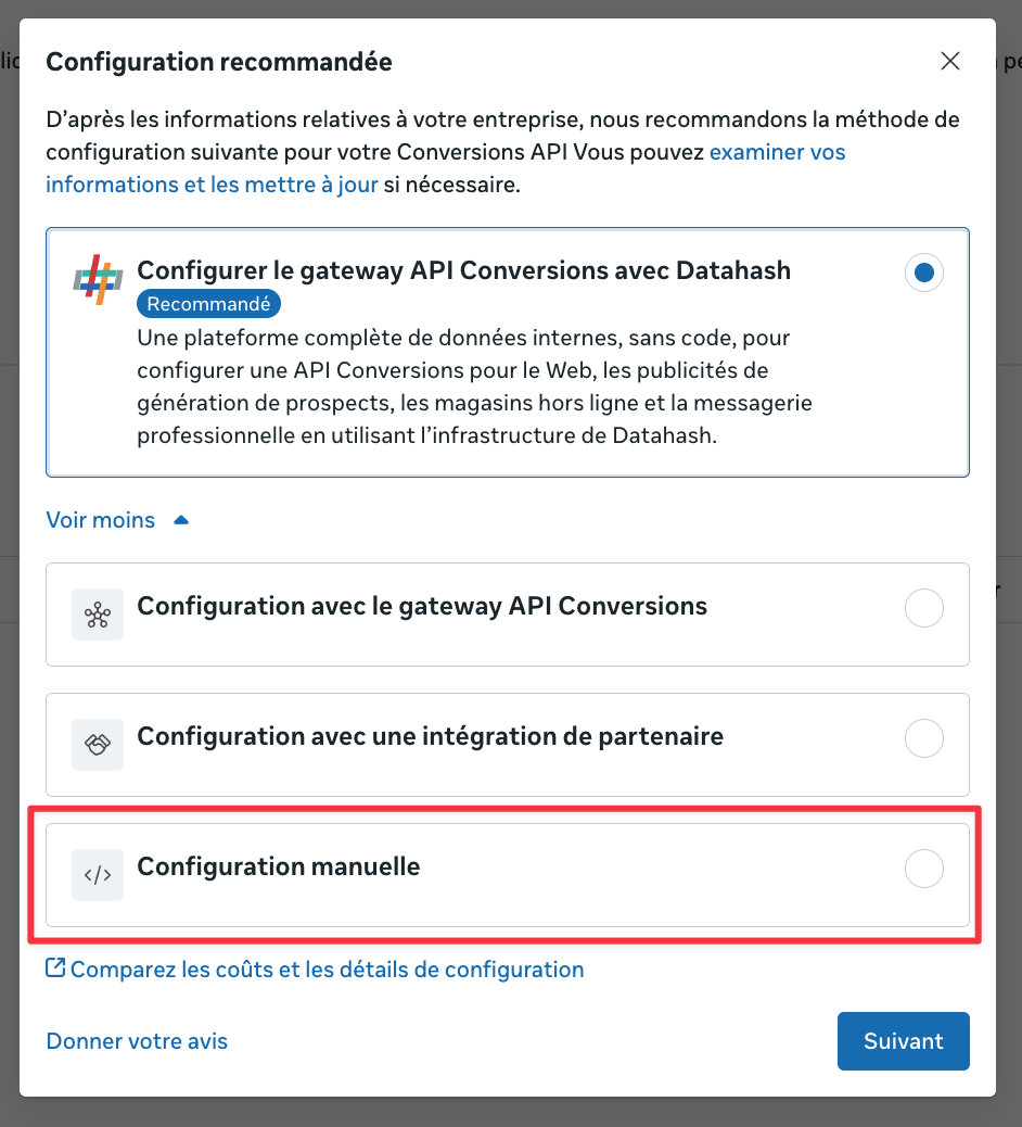 Meta vous proposera une Configuration. Cliquez sur Voir les autres méthodes de configuration et sélectionnez l'option Configuration manuelle (via intégration directe).