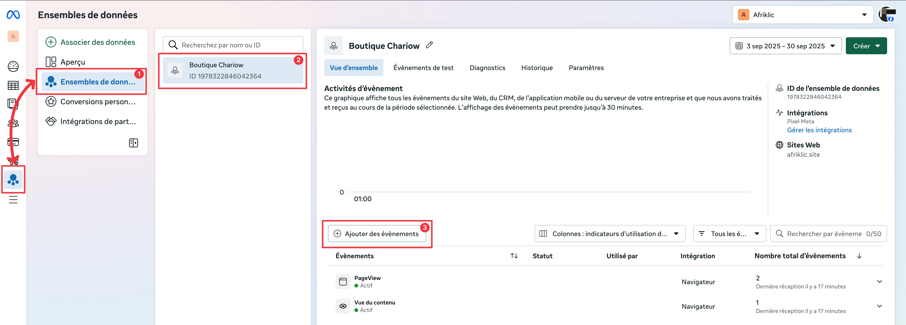 Dans le Gestionnaire d'événements, naviguez vers l'onglet Ensembles de données (1) et sélectionnez l'ensemble de données (Pixel) de votre boutique Chariow (2).