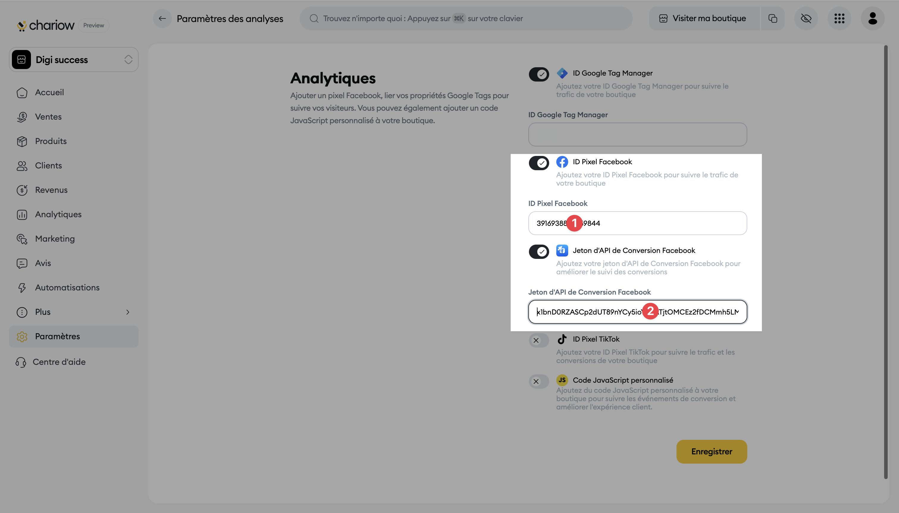 Collez votre ID de Pixel Meta (si ce n'est pas déjà fait) dans le champ approprié(1).