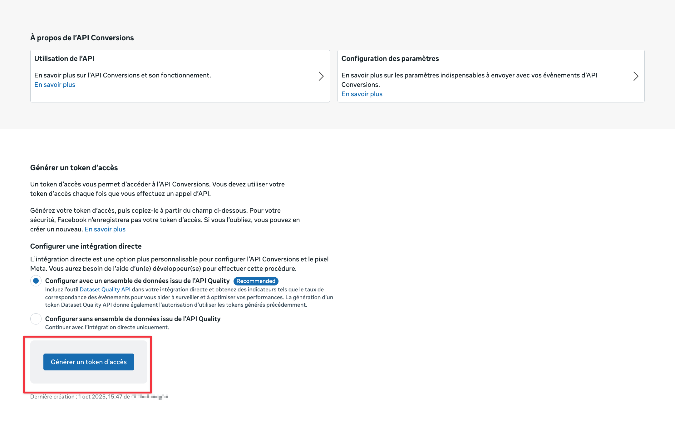 Une fois les étapes précédentes terminées, vous arrivez directement sur la page d'utilisation de l'API de Conversions. C'est ici que vous générez la clé de connexion :