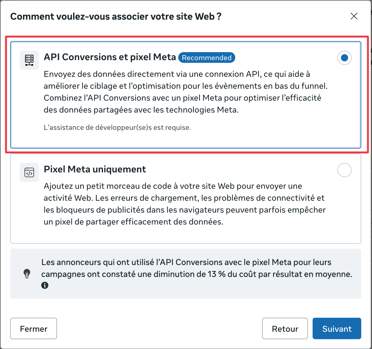 La fenêtre suivante vous demandera comment vous souhaitez associer votre site Web. Sélectionnez l'option API Conversions et Pixel Meta pour combiner le suivi navigateur et serveur.