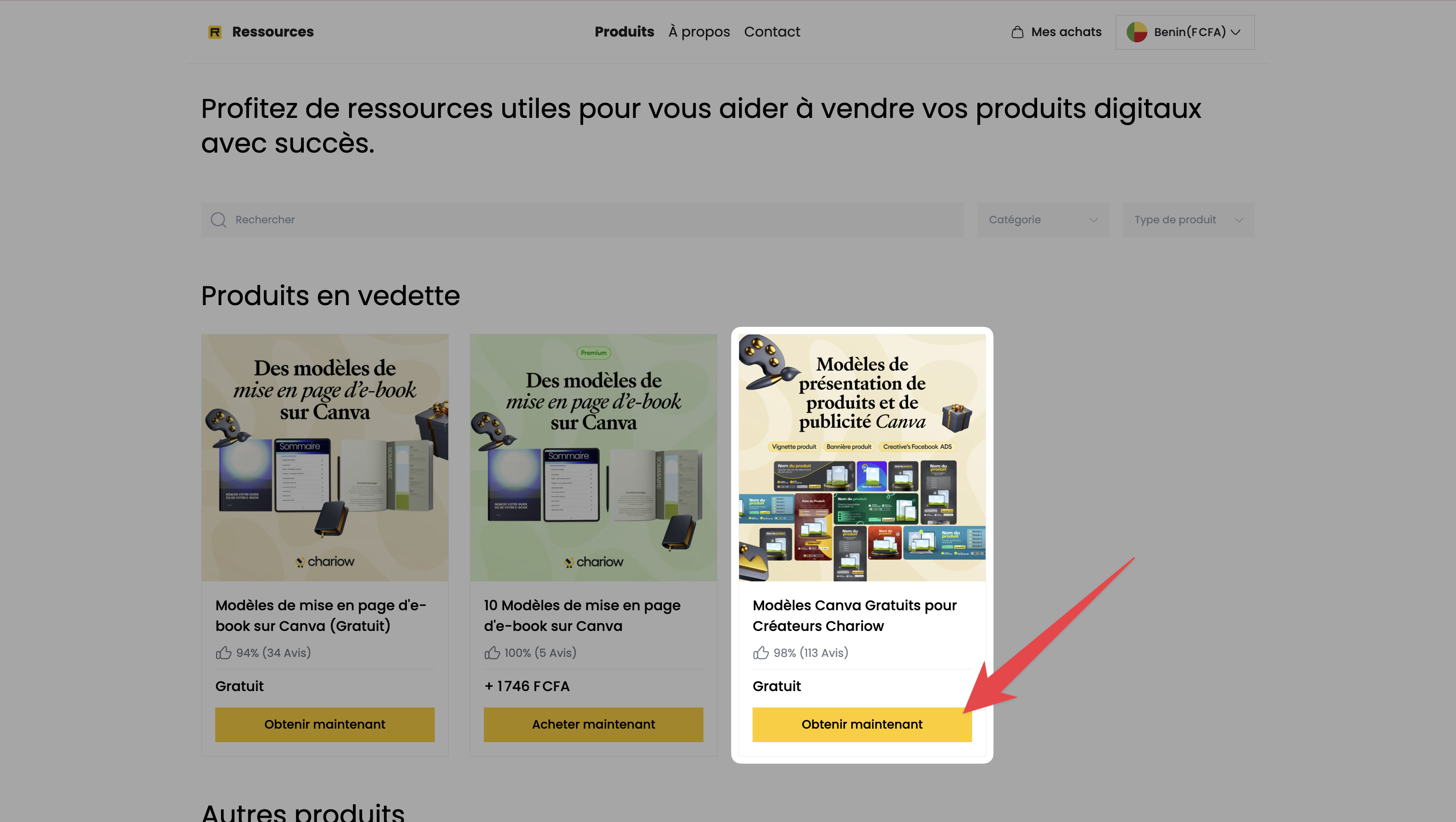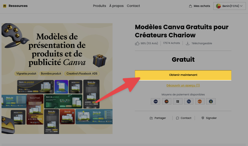 Choisissez le Modèles Canva Gratuits pour Créateurs Chariow et cliquez sur le bouton "Obtenir maintenant" associé.