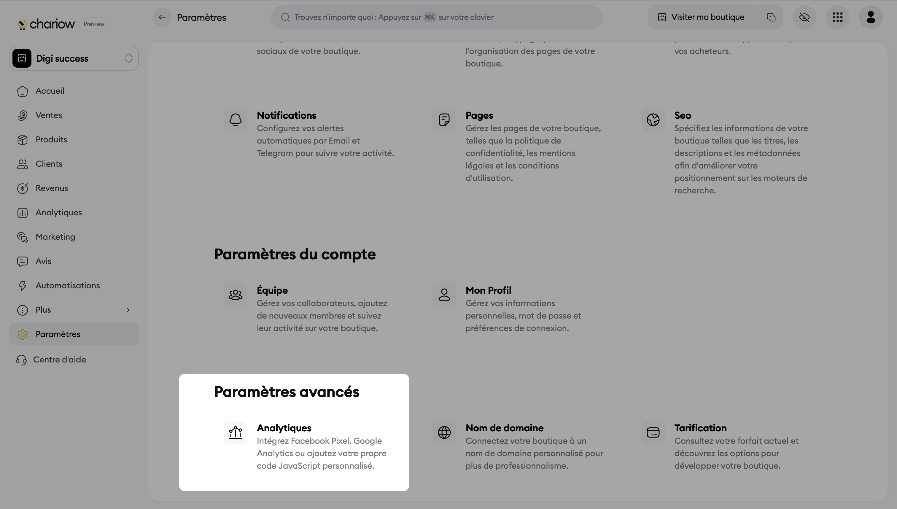 Allez dans Paramètres puis accédez à la section Analytiques au niveau des paramètres avancés.