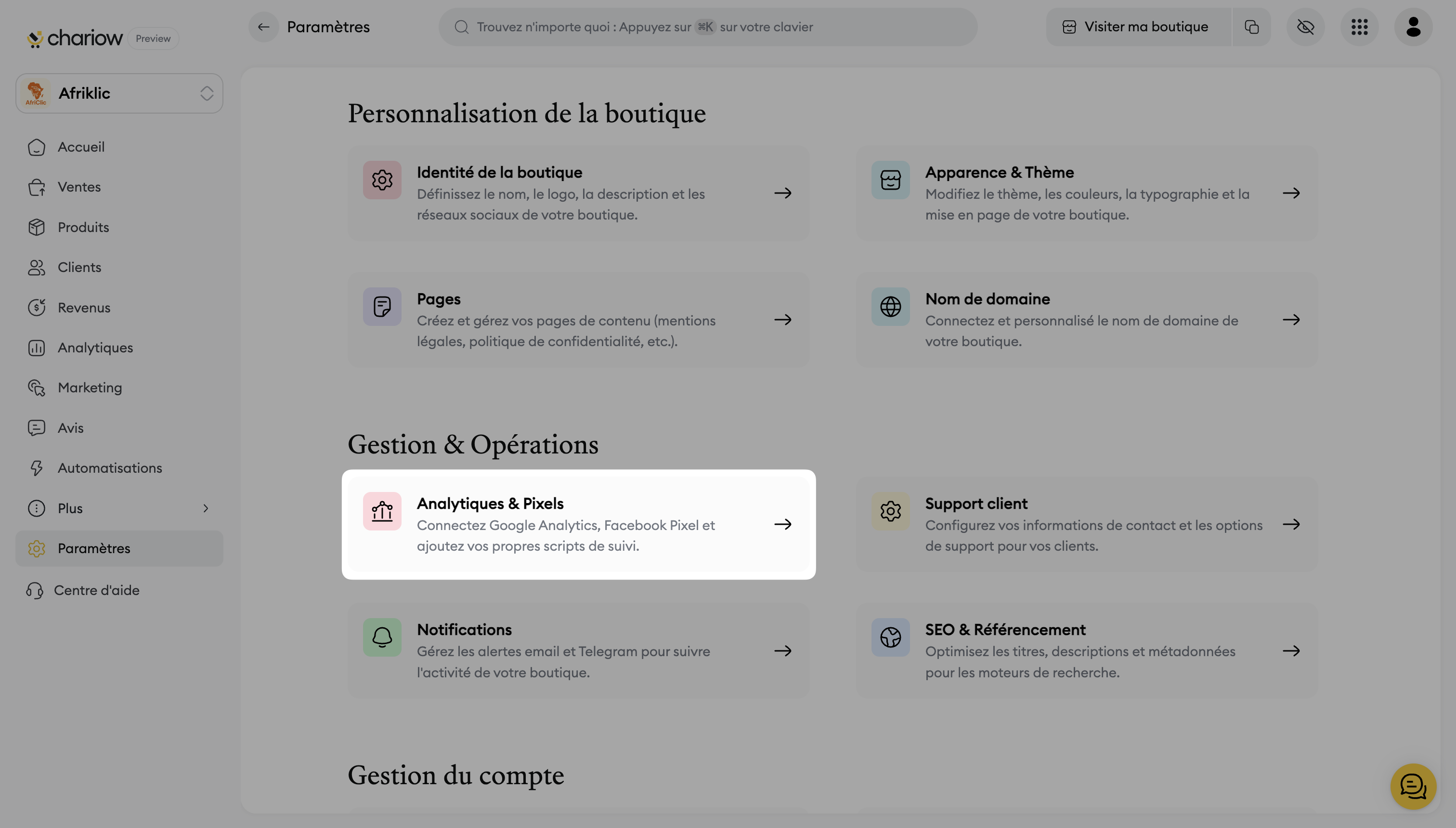 Allez dans Paramètres puis accédez à la section Analytiques & Pixels au niveau de Gestion & Opérations.
