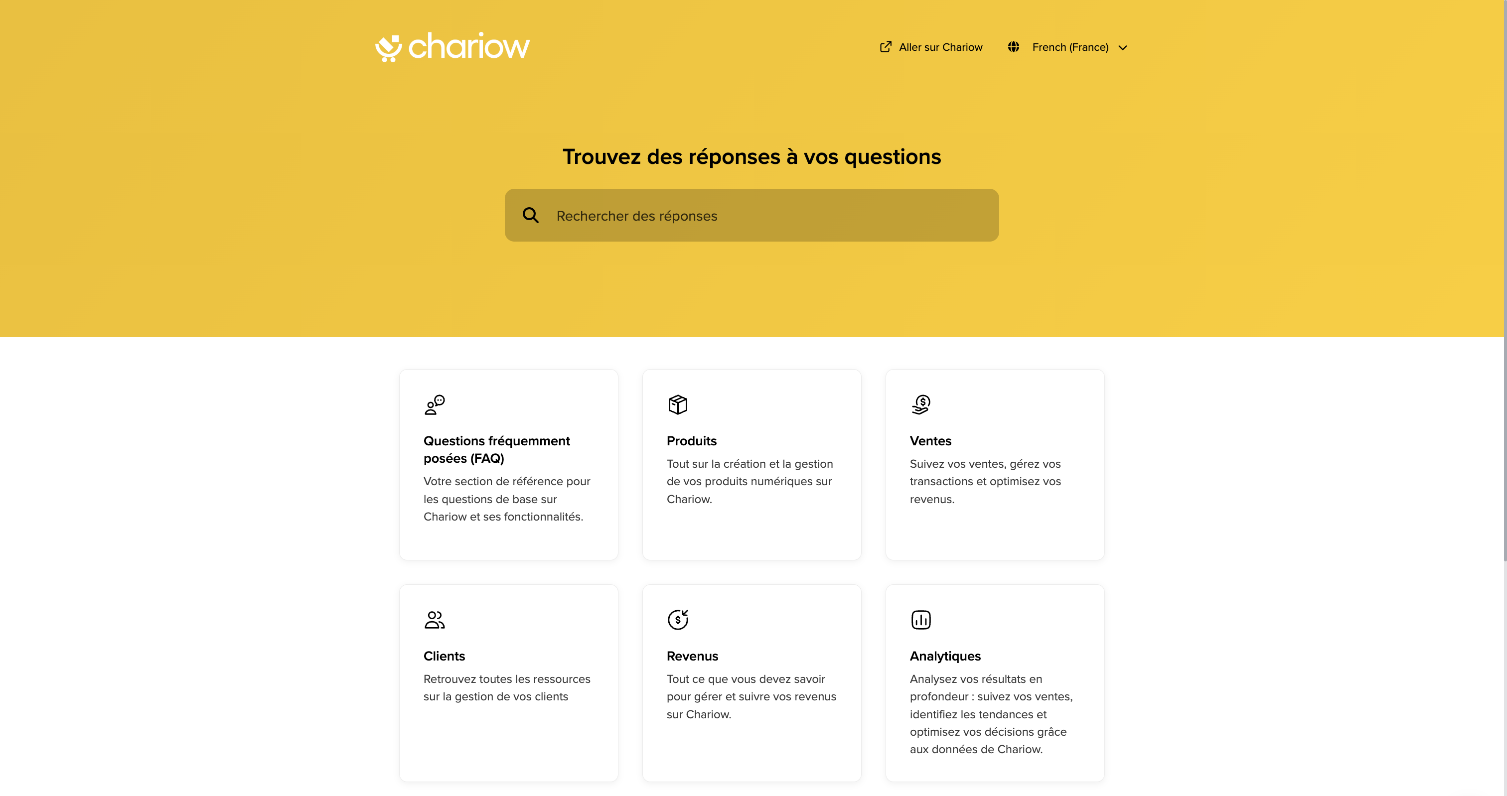 Accès : Directement via https://help.chariow.com/ ou via le lien "Centre d'aide" dans votre tableau de bord Chariow.